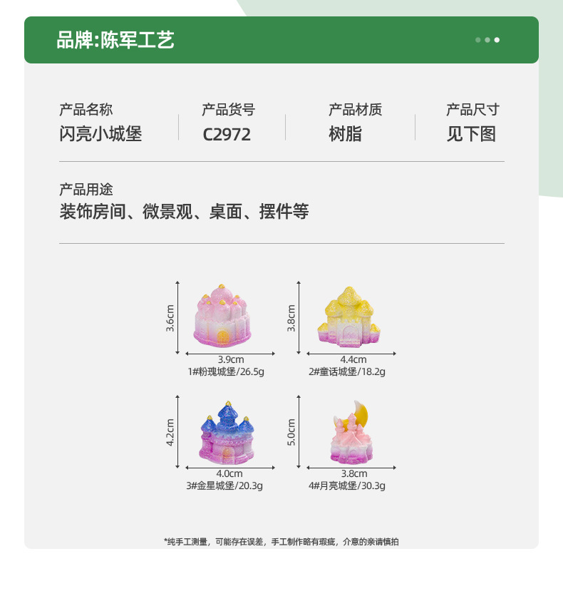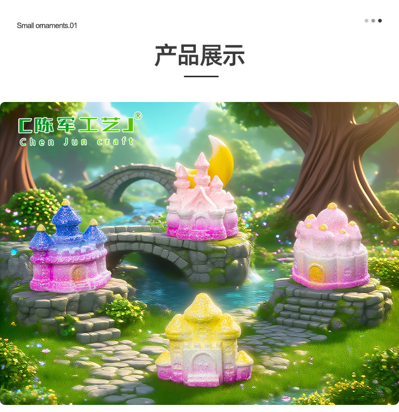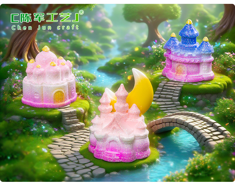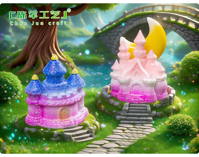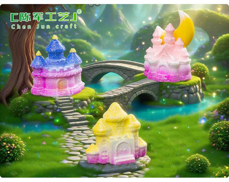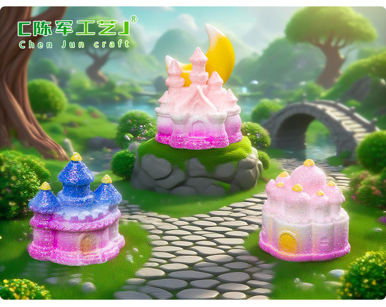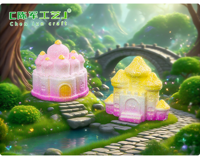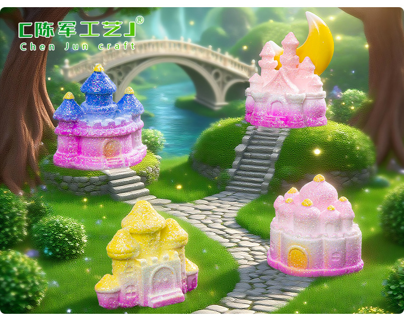 材质: 树脂 类别: 树脂工艺品 风格: 卡通 品牌: 陈军工艺 包装: 普通包装 货号: C2972 是否专利货源: 否 颜色: 1#粉瑰城堡,2#童话城堡,3#金星城堡 尺寸: 闪亮小城堡 是否属于礼品: 否