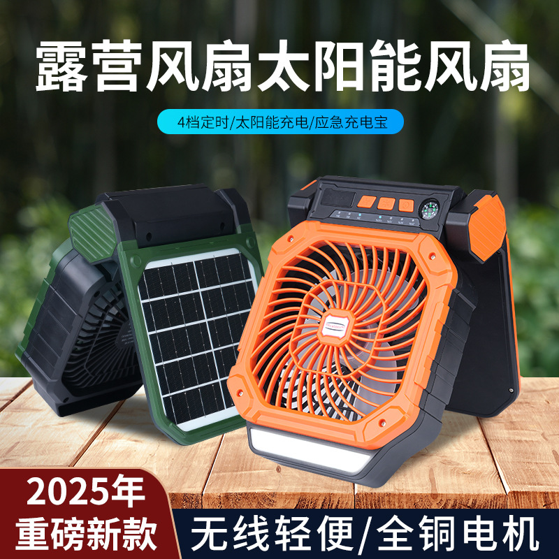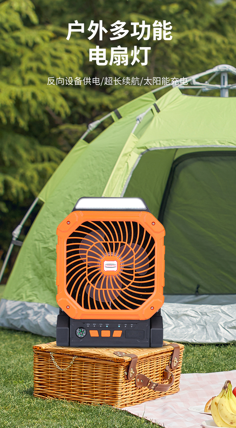 卖点:无刷电机,四档+变频风,带LED灯,摇头,定时,大容量户外风扇,太阳能充电,使用时间长,带灯方便户外照明(车载,居家,户外露营,工作)
