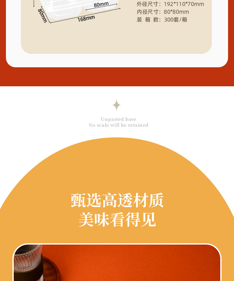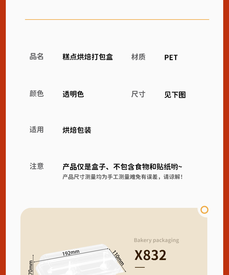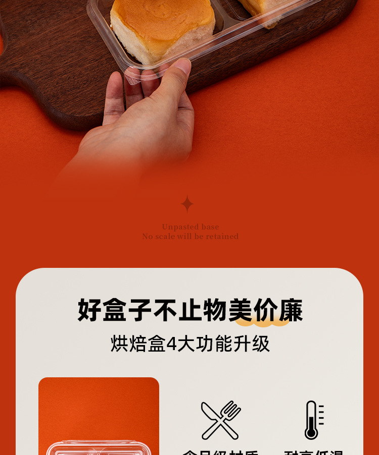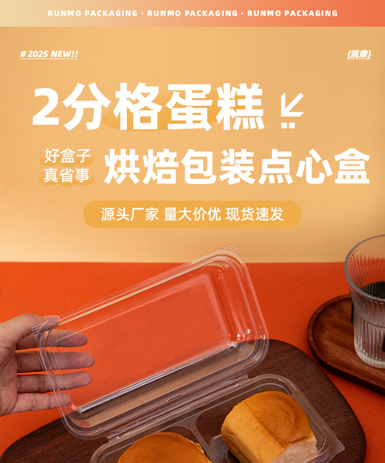 品牌: 润摩 包装层次: 初级包装 主要销售地区: 其他 是否跨境出口专供货源: 否 加工定制: 否 误差: ±5mm 货号: X832 包装型式: 袋装 是否可降解: 否 是否进口: 否 有可授权的自有品牌: 否 全国工业生产许可证编号: 咨询客服 适用对象: 面包,蛋糕,西点 风格: 简约 产地: 浙江 功能性特点: 透明加厚 工艺: 吸塑 规格: 2分格打包盒-整箱1050套 颜色: 透明 材质: 整箱拍发货