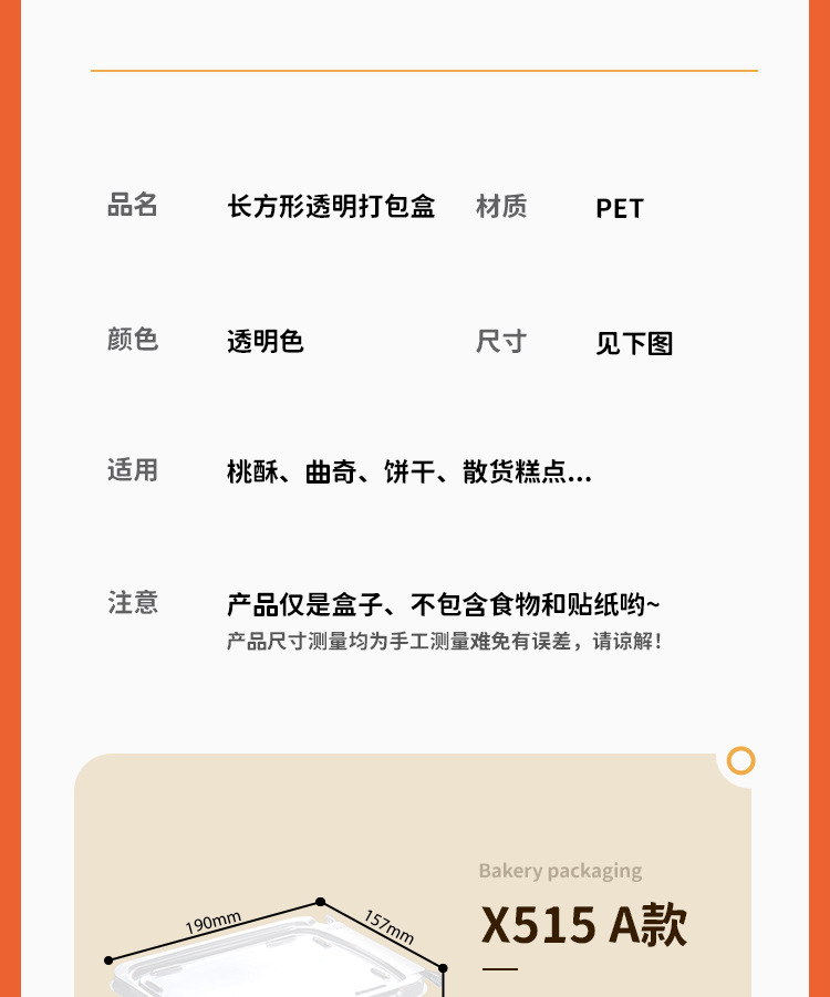品牌: 润摩 包装层次: 初级包装 主要下游平台: 淘宝 主要销售地区: 中国 是否跨境出口专供货源: 否 加工定制: 否 误差: ±2mm 货号: X514 X515 原产国/地区: 中国义乌 包装型式: 袋装 是否可降解: 是 是否进口: 否 有可授权的自有品牌: 否 全国工业生产许可证编号: 咨询客服 适用对象: 蛋黄酥 风格: 简约 产地: 中国 浙江 功能性特点: 透明加厚 工艺: 吸塑 规格: 平底中高款整箱500套,平底高款整箱50