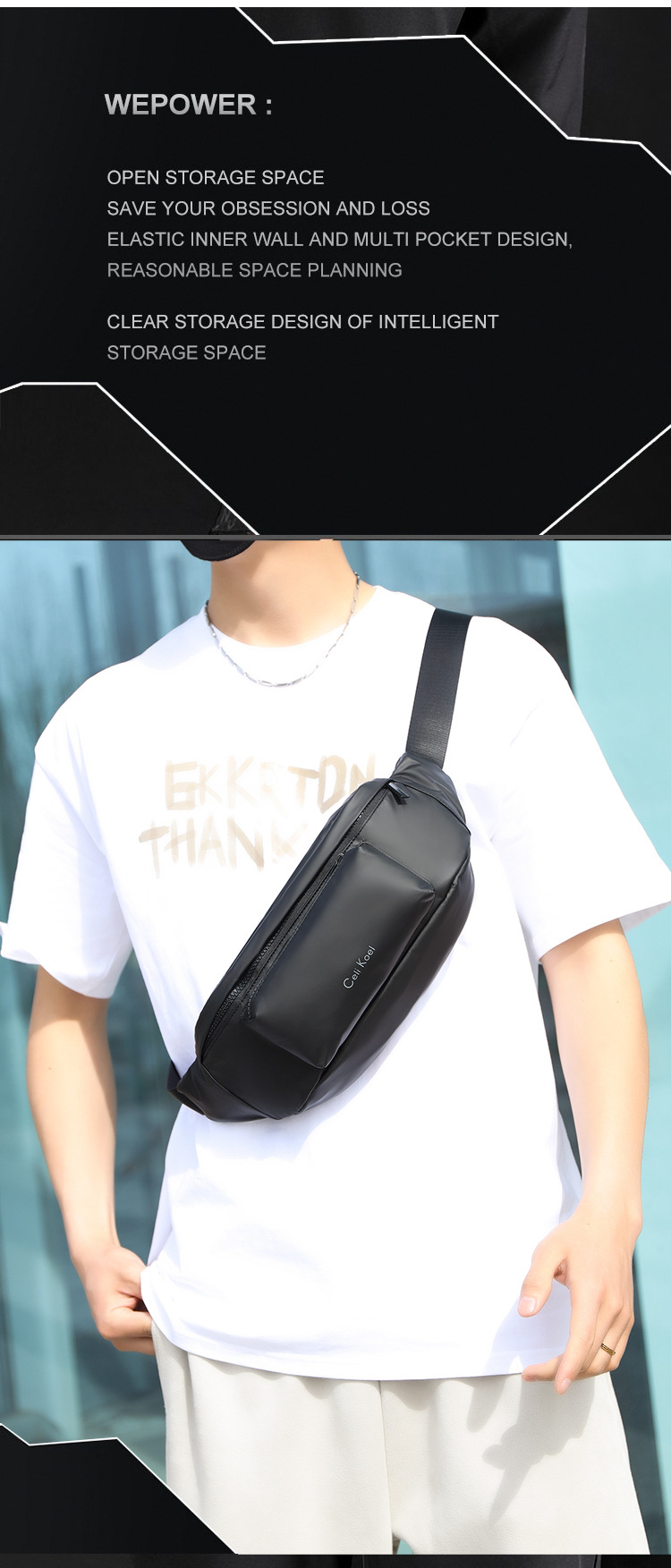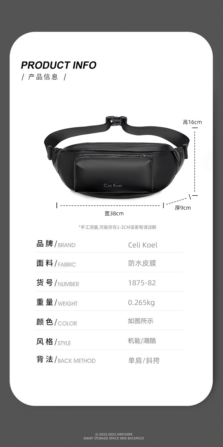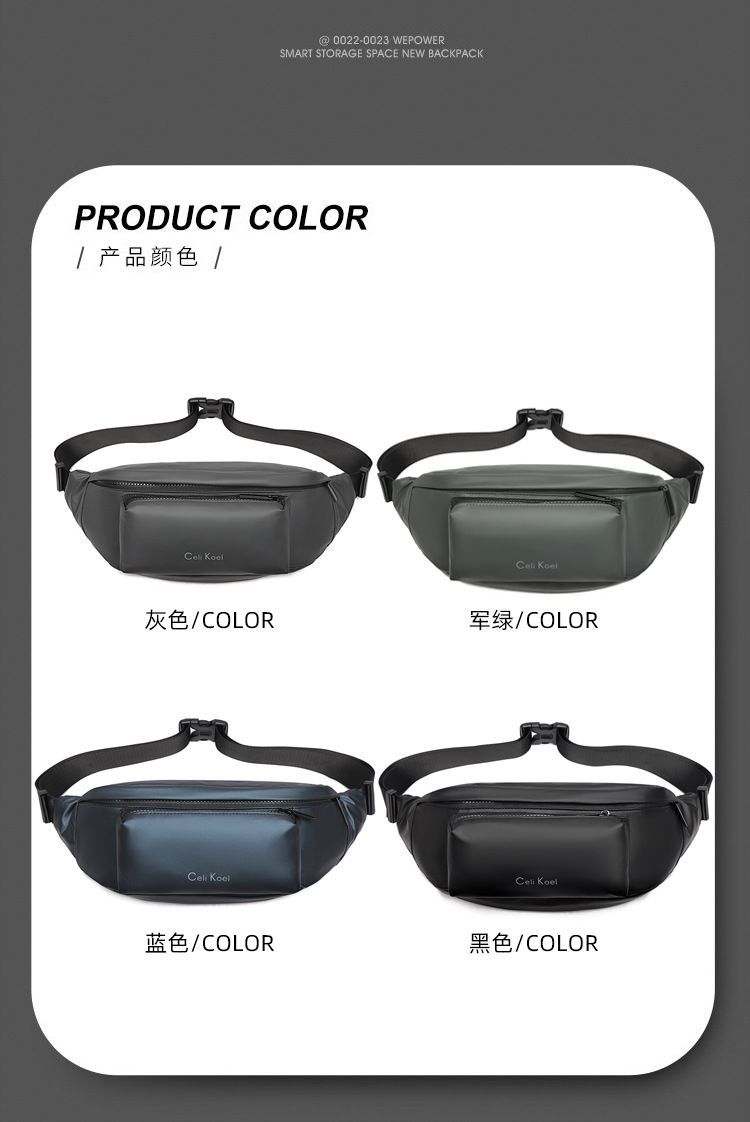 材质: PU皮 功能: 防水 里料质地: 涤纶 品牌: CeliKoel 风格: 街头潮流 流行元素: 字母 货号: 1875-82 图案: 纯色 颜色: 黑色,灰色,军绿色,蓝色 上市年份季节: 2023年春季 适用场景: 日常搭配 重量: 0.265 kg/件