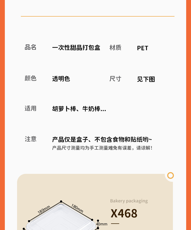 品牌: 润摩 包装层次: 初级包装 主要下游平台: 淘宝 主要销售地区: 中国 是否跨境出口专供货源: 否 加工定制: 否 误差: ±2mm 货号: X468 原产国/地区: 中国 包装型式: 袋装 是否可降解: 是 是否进口: 否 有可授权的自有品牌: 否 全国工业生产许可证编号: 咨询客服 适用对象: 面包 风格: 简约 产地: 中国浙江 功能性特点: 透明加厚 工艺: 吸塑 规格: 烘焙包装盒400套