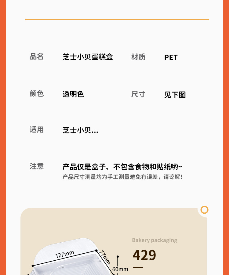品牌: 润摩 包装层次: 初级包装 主要下游平台: 淘宝 主要销售地区: 中国 是否跨境出口专供货源: 是 加工定制: 是 误差: ±2mm 货号: 429 原产国/地区: 中国义乌 包装型式: 袋装 是否可降解: 是 是否进口: 否 有可授权的自有品牌: 否 全国工业生产许可证编号: 咨询客服 适用对象: 芝士 风格: 简约 产地: 中国 浙江 功能性特点: 透明加厚 工艺: 吸塑 规格: 芝士小贝盒-整箱1100套