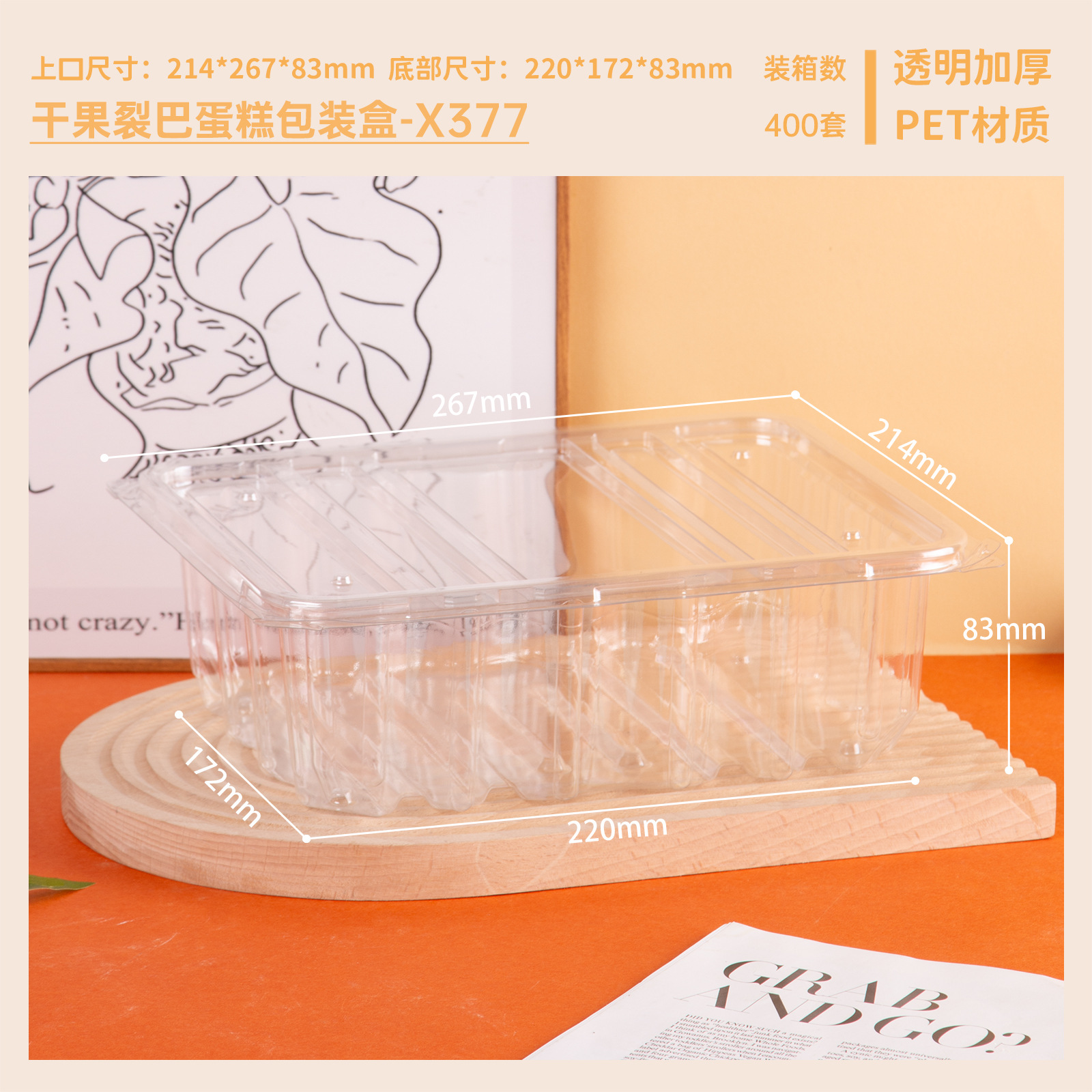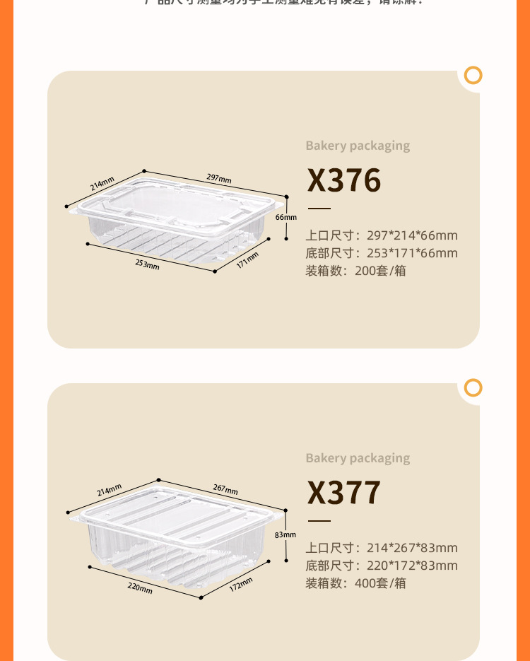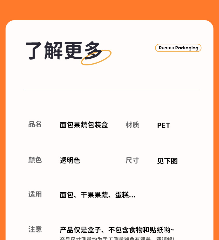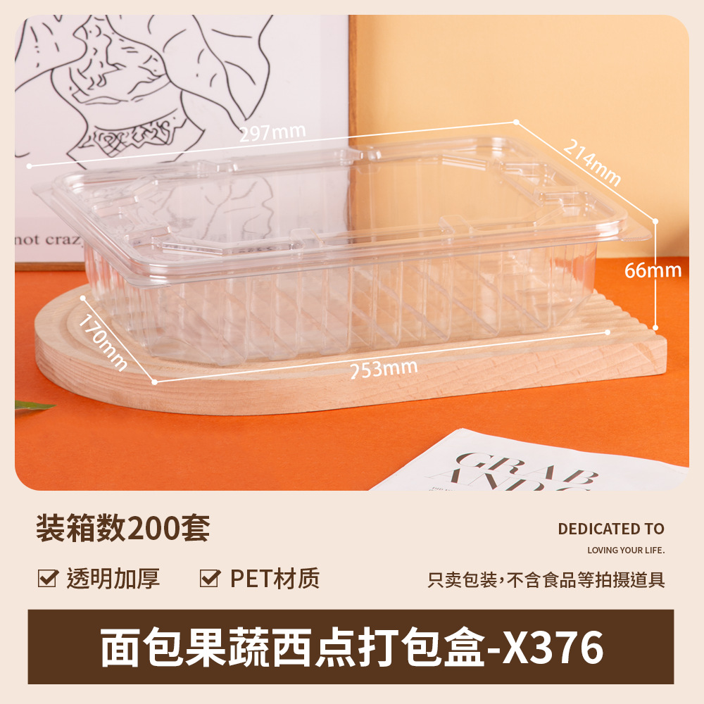 品牌: 润摩 包装层次: 初级包装 主要下游平台: 亚马逊 主要销售地区: 中国 是否跨境出口专供货源: 否 加工定制: 否 误差: ±5mm 货号: X376 X377 原产国/地区: 中国 包装型式: 袋装 是否可降解: 否 是否进口: 否 有可授权的自有品牌: 否 全国工业生产许可证编号: 咨询客服 适用对象: 面包 风格: 简约 产地: 中国 浙江 功能性特点: 透明加厚 工艺: 吸塑 规格: 裂巴面包盒400套,果蔬打包盒整箱200