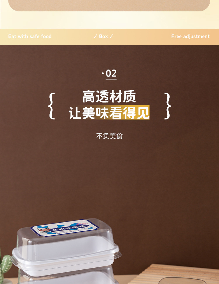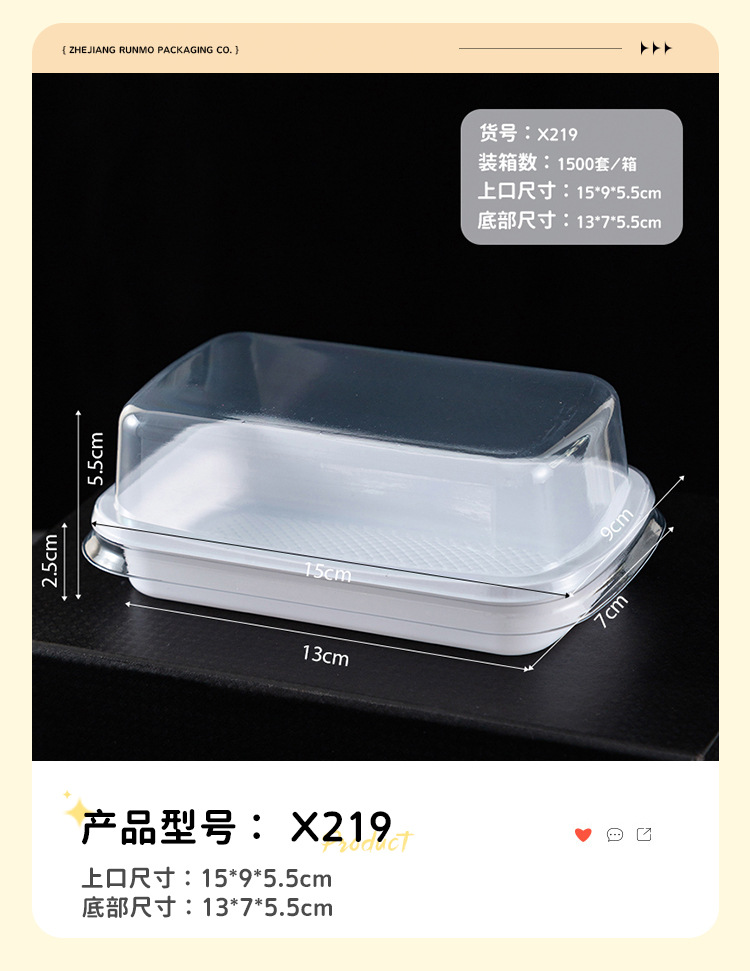 品牌: 润摩 包装层次: 初级包装 是否跨境出口专供货源: 否 加工定制: 否 误差: ±5mm 货号: X219 包装型式: 袋装 是否可降解: 是 是否进口: 否 全国工业生产许可证编号: 咨询客服 适用对象: 甜品 蛋糕 风格: 简约 产地: 浙江 功能性特点: 透明加厚 工艺: 吸塑 销售方式: 店铺下单 规格: 长方形盒-整箱1500套 颜色: 透明 材质: 整箱拍发货 日生产量: 多