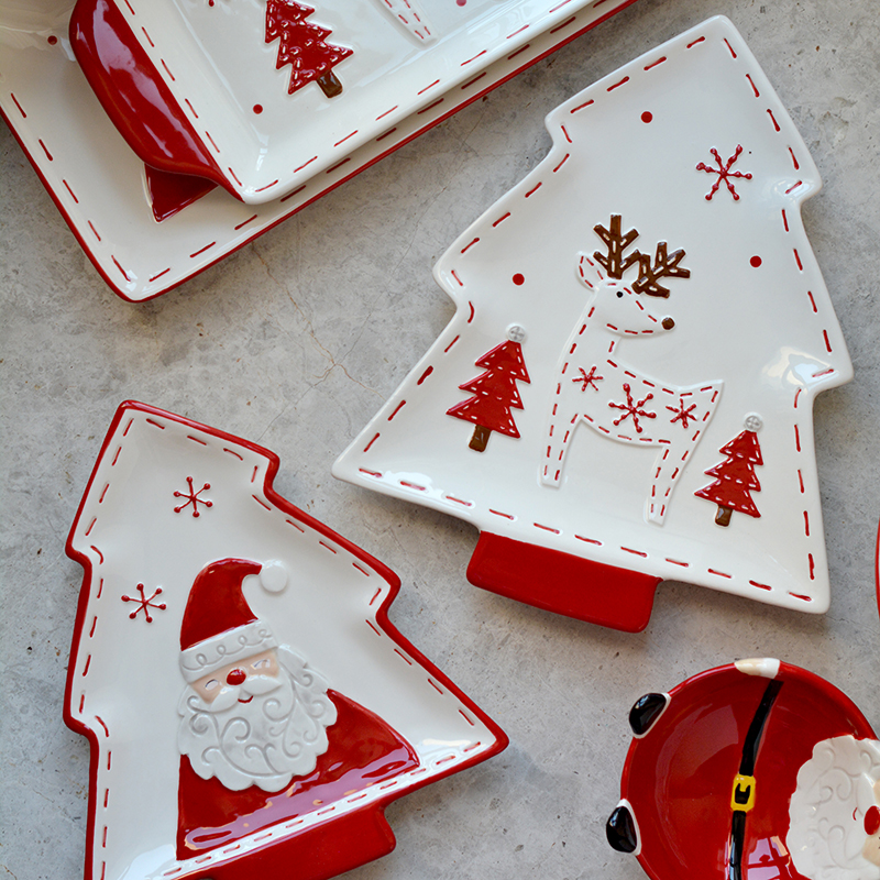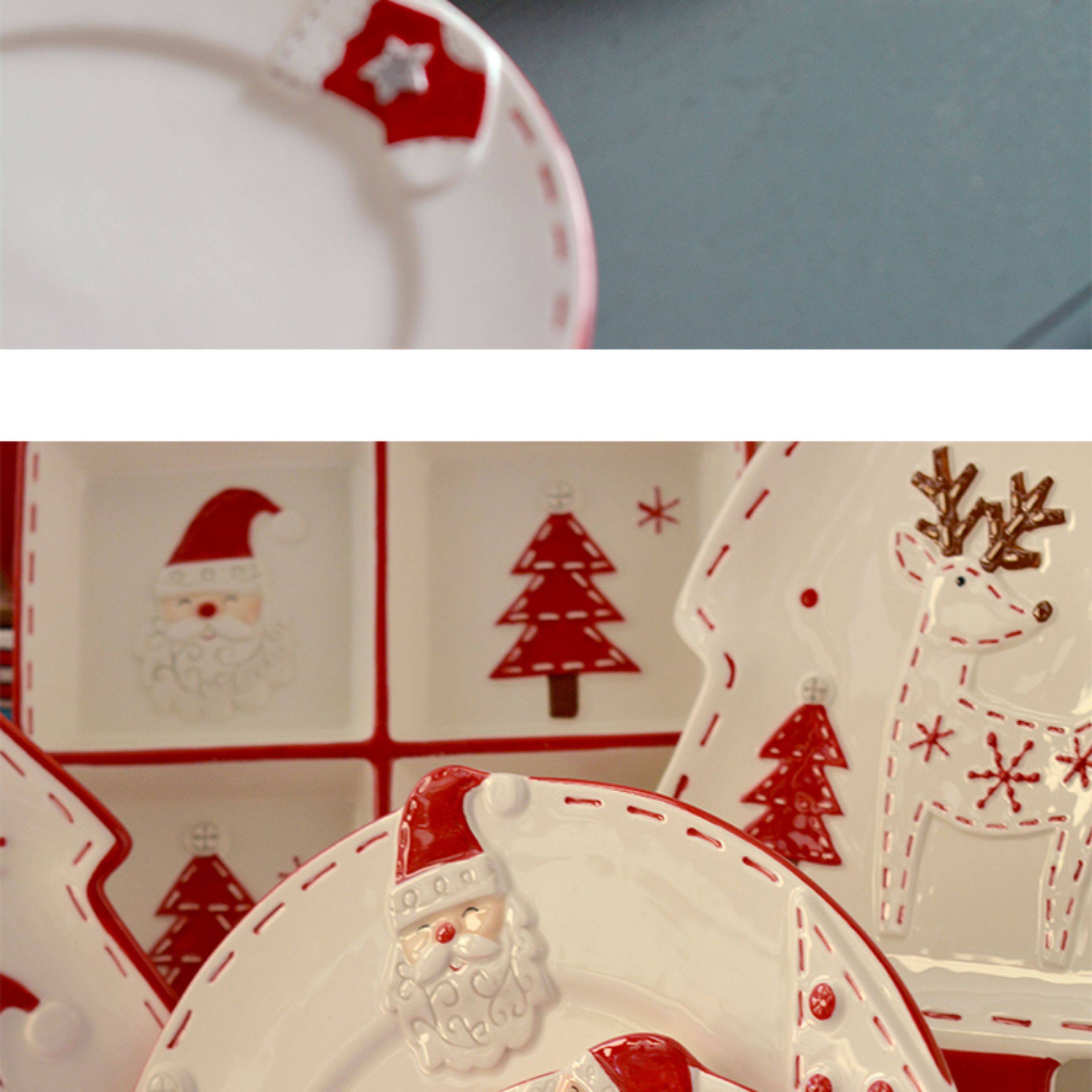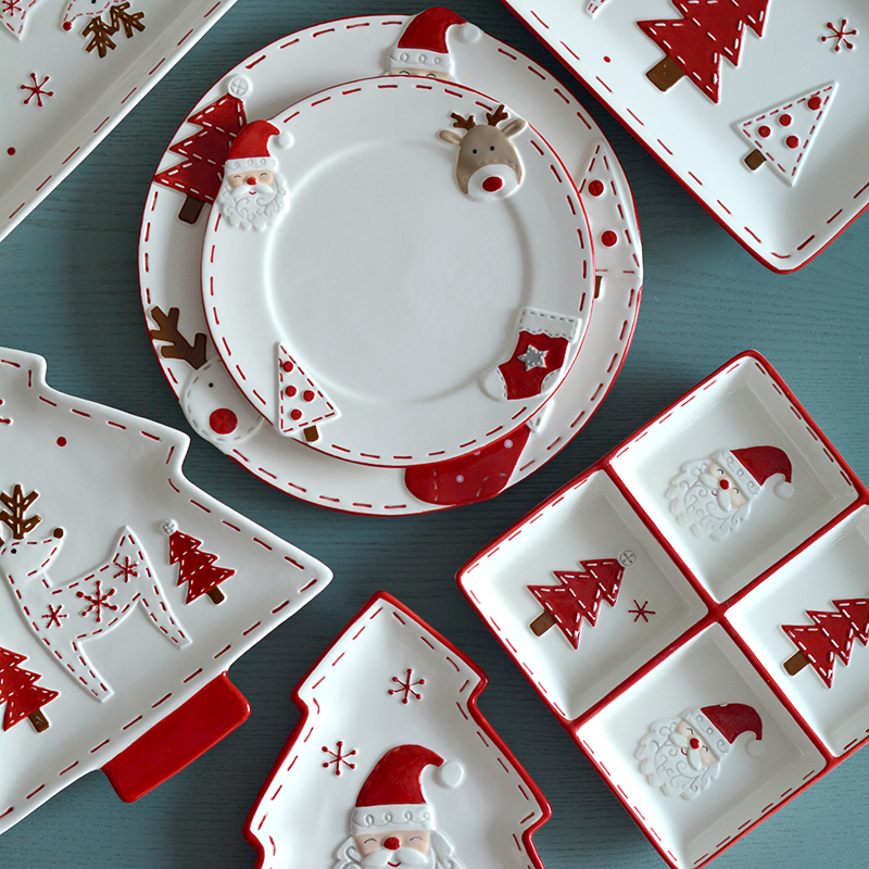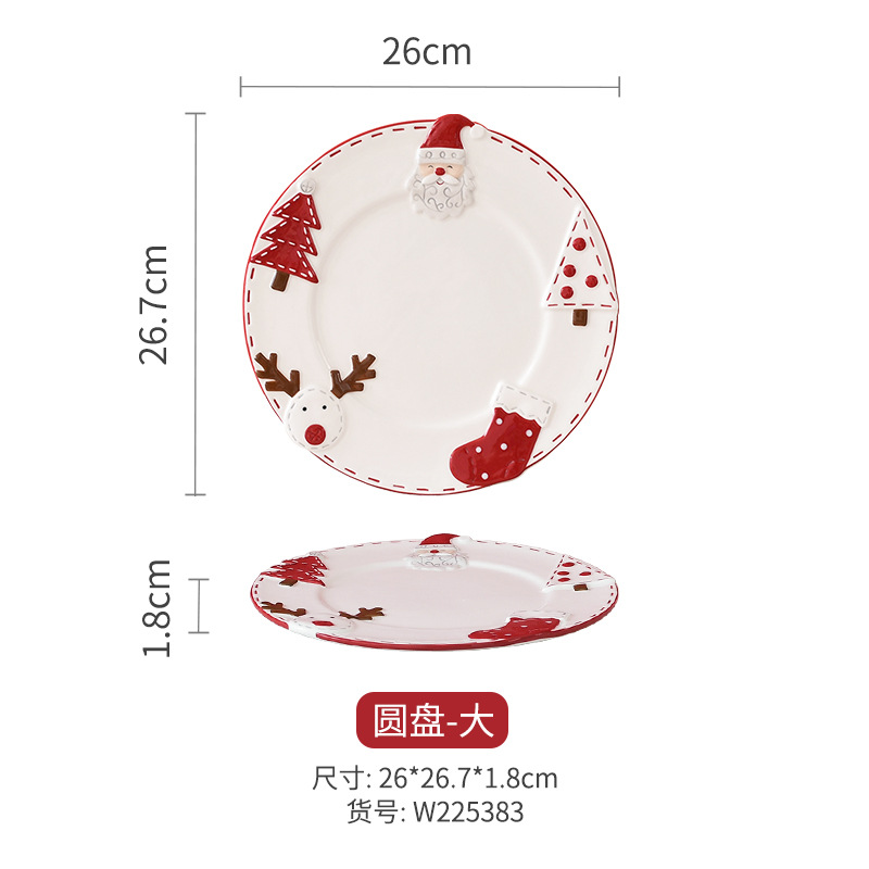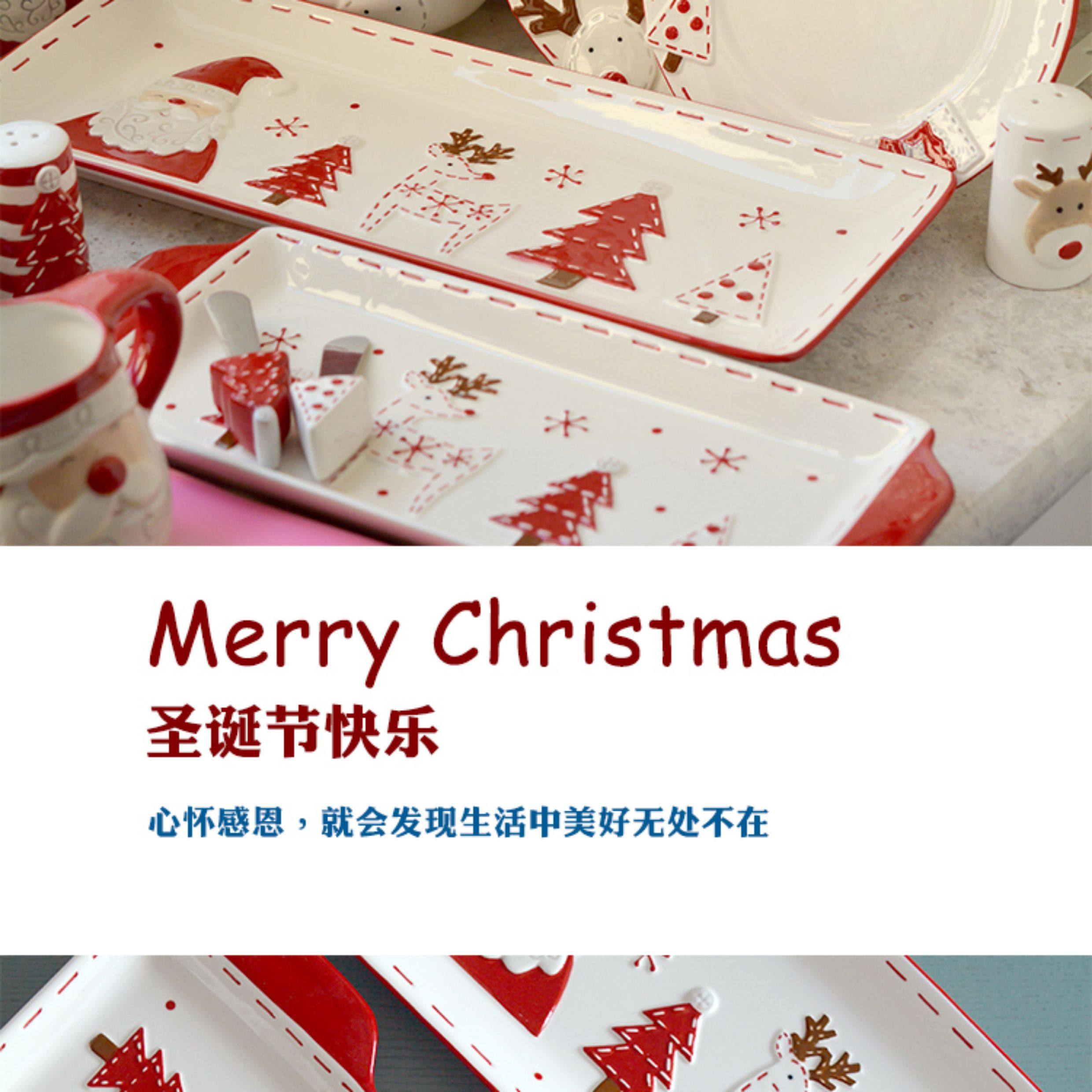 圣诞手绘陶瓷餐具套装可爱牛排盘浮雕釉彩平盘密封罐茶具陶瓷碗