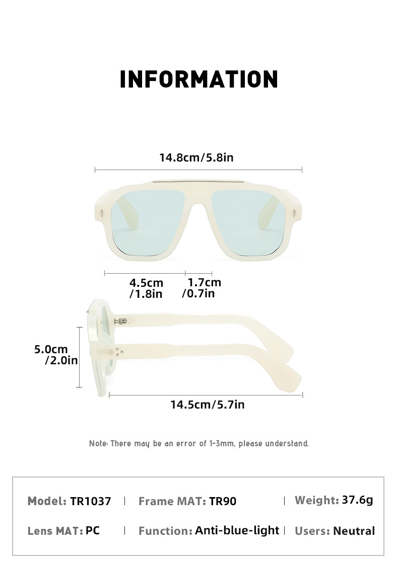 是否偏光: 否 抗UV等级: UV400 镜片材质: PC 品牌: MOSHA 眼镜款式: 飞行员式 镜框材质: TR90 镜架材质: TR90 是否支持近视镜: 不支持近视镜 货号: TR1037 镜片颜色: 黑色 镜架颜色: 黑色 透射比分类: 3类/遮阳镜 眼镜结构: 全框 流行元素: 如意,图腾,祥云,水波纹,万字,龙凤纹饰 上市年份/季节: 2026年春季 是否跨境出口专供货源: 否 产地: 台州 镜片分类: PC镜片 新款时尚外贸太阳镜: 新款时尚外贸太阳镜 适用性别: 通用 重量: 0.5 kg/副