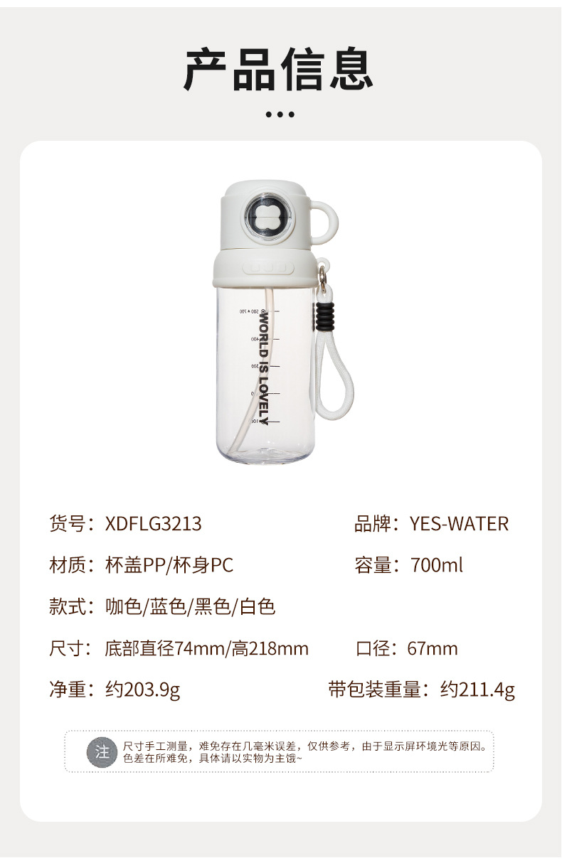 材质: PC 功能: 环保 品牌: YES-WATER 尺寸(高度、口径): 74/218mm 口径67mm 样式: 带吸管 加印LOGO: 不可以 产品类别: 塑料杯 是否进口: 否 产品类型: 提手吸管杯 风格: 运动 货号: XDFLG3213 结构: 单层 适用场所: 其他 适用对象: 通用 图案: 字母 微波炉: 不可用 形状: 运动杯 重量: 净重203.9g带包装重211.4g 适用人群: 通用 贸易属性: 外贸+内贸