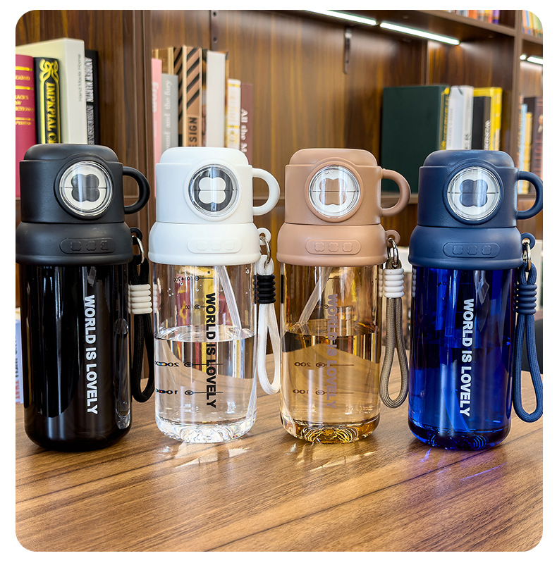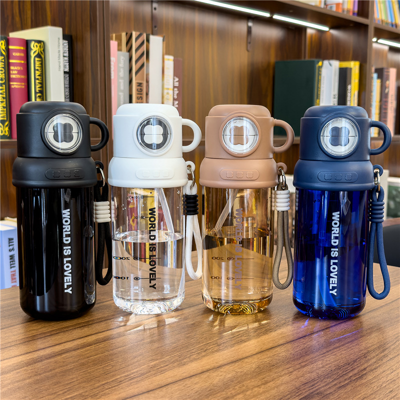 夏季童趣时光塑料杯提绳便携户外运动儿童水杯带刻度学生吸管杯子