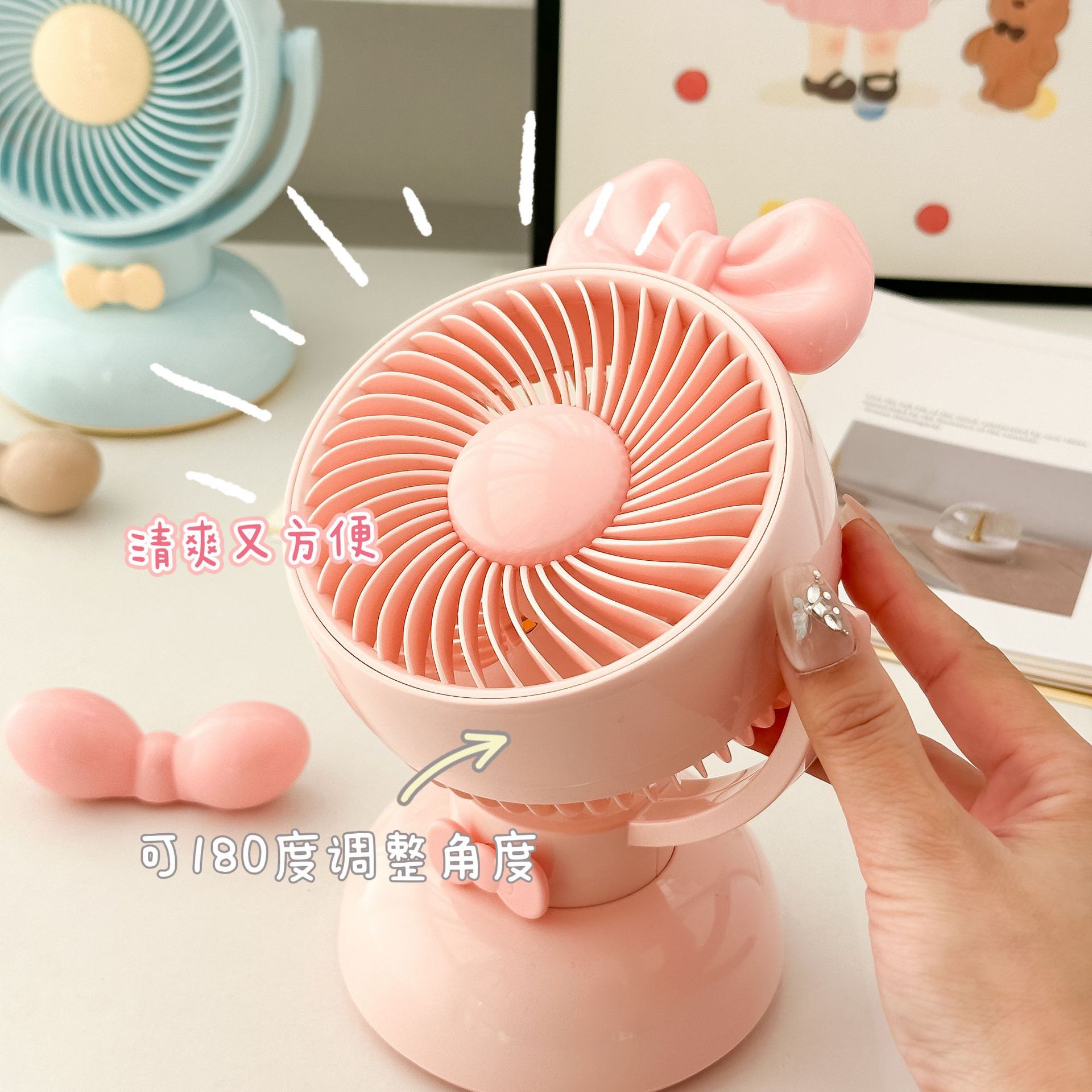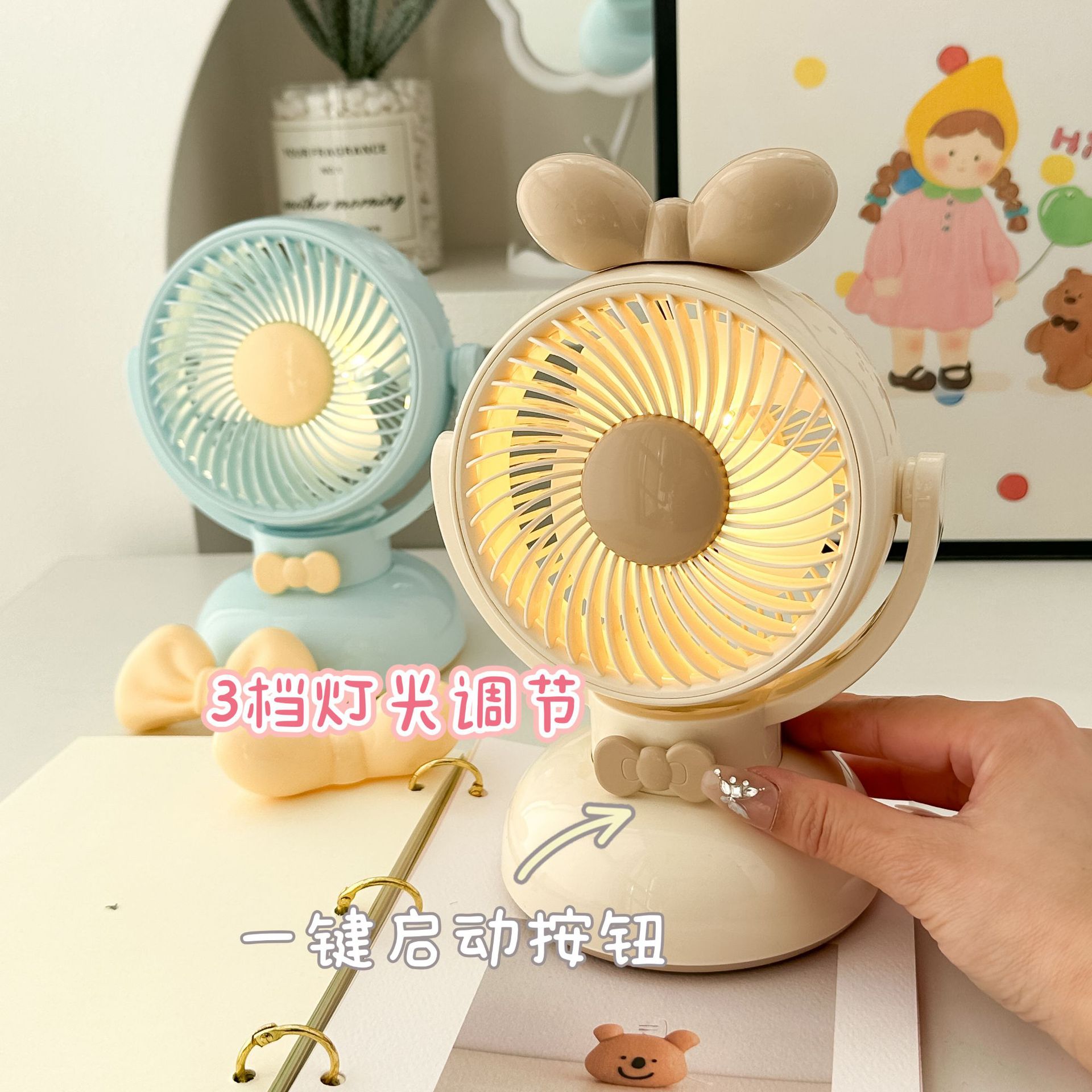 风速:三档调节,长按开关带灯光,配套2款蝴蝶结可自行DIY粘上