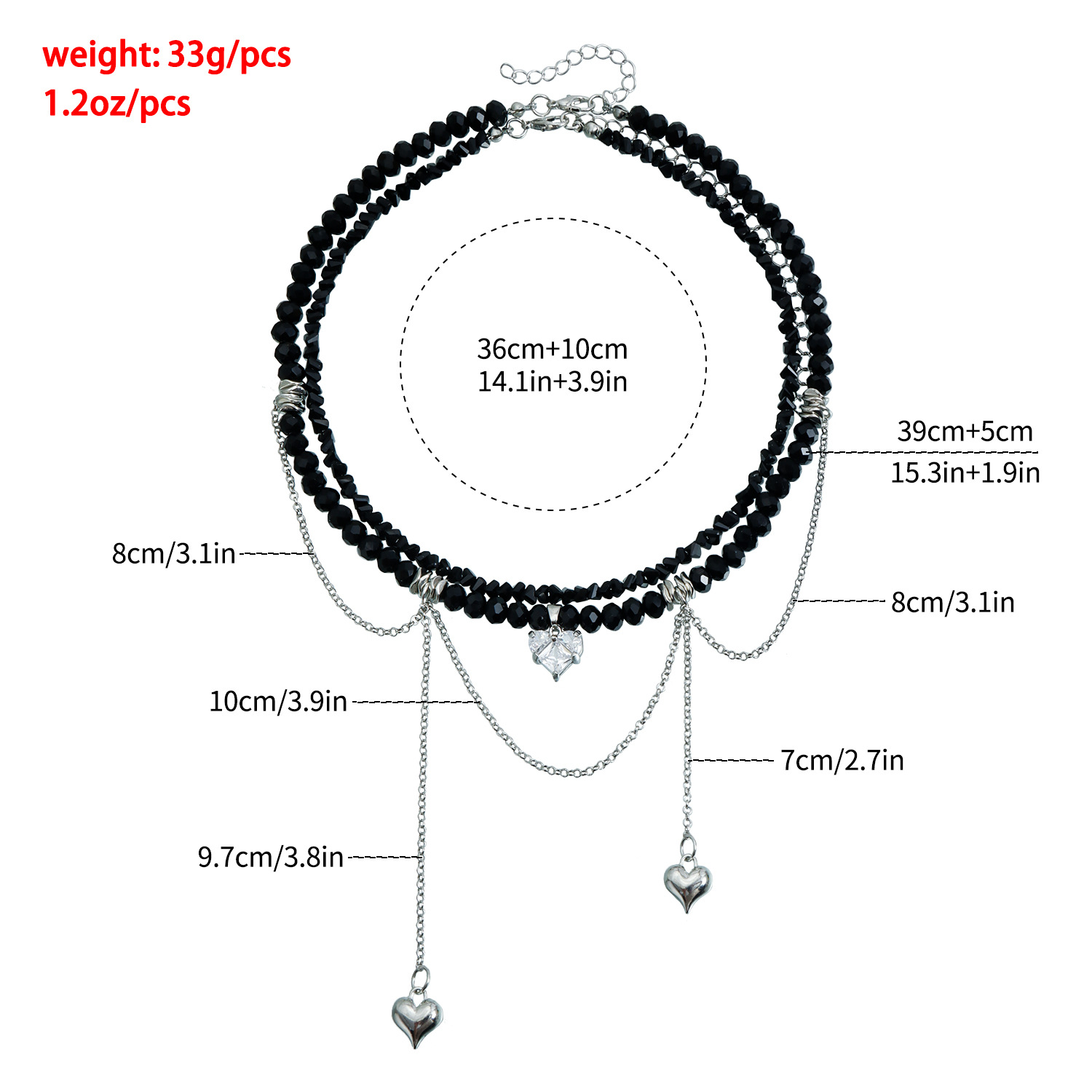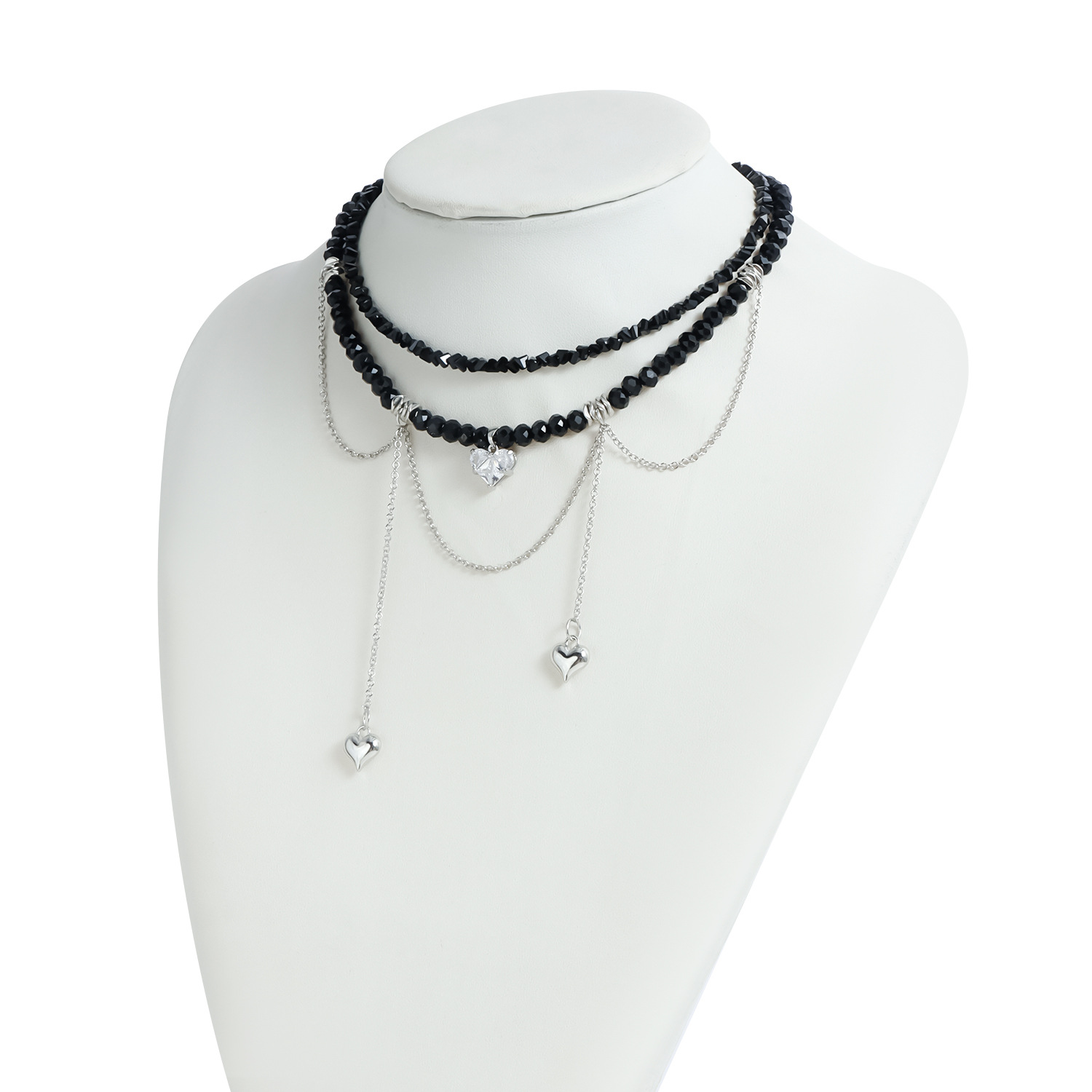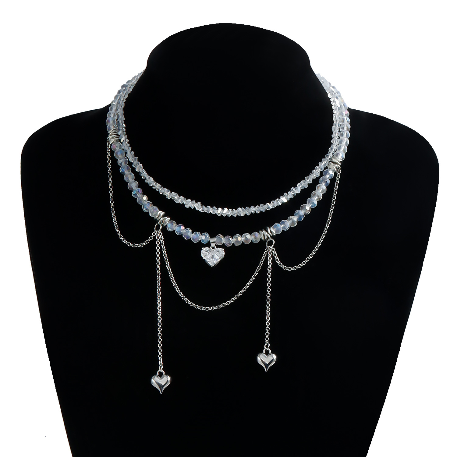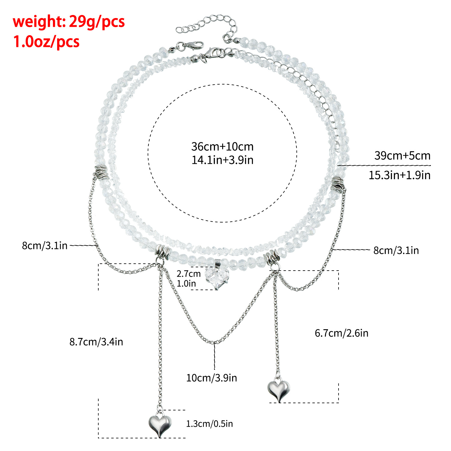 材质: 玻璃/琉璃 处理工艺: 电镀 链子样式: 锁骨链 坠子材质: 合金 品牌: 佐文(饰品) 流行元素: 爱心/心形 造型: 心形,几何型 货号: ZW586 产地: 义乌 是否多层: 是 周长: 31cm(含)-40cm(含) 颜色: ZW586 白色,ZW586 黑色 有可授权的自有品牌: 是 是否跨境出口专供货源: 是 上市年份/季节: 2024年冬季 风格: 欧美 适用场景: 休闲 重量: 29 风格分类: 时尚通勤 适用人群: 女式 重量: 0.444 kg/个