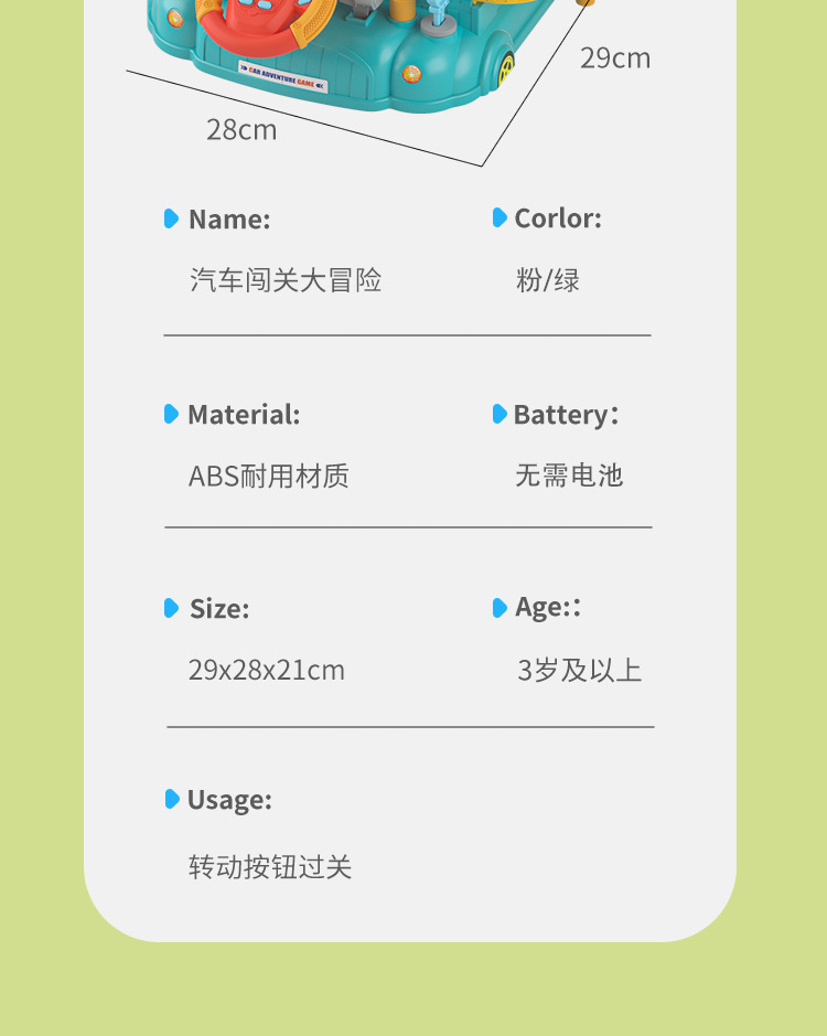 玩具材质: 塑料 是否含遥控: 否 遥控方式: 体感 包装: 彩盒 特色功能: 多功能手动闯关 适用年龄: 儿童(4-6岁) 适用人群: 不限 是否进口: 国产 能力培养: 智力开发,动手动脑 是否有动漫形象: 否 货号: A333-330F 是否有导购视频: 是 是否专供外贸: 是(本商品仅供外贸用途,可能不符合境内产 颜色: 汽车大冒险【绿色】,汽车大冒险【粉色】, 规格: 3辆小车,6辆小车,9辆小车 重量: 1.0 kg/盒