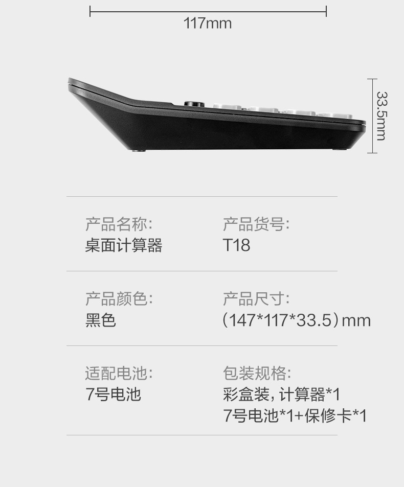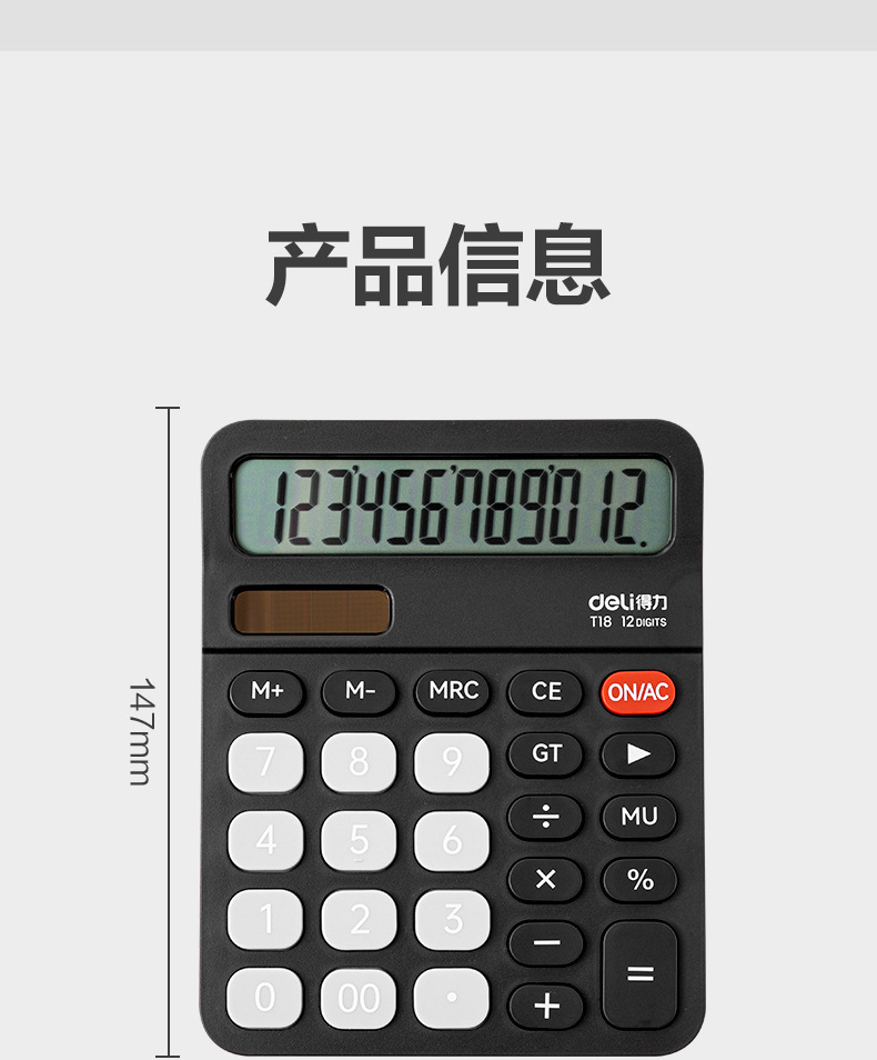 品牌: Deli/得力 产品类型: 算数计算器 是否带电池: 是 材质: ABS塑料 是否带语音功能: 是 适配电池: 普通干电池 货号: CX-LQY-T18 型号: T18 规格: T18无语音【12位大屏幕】双电源 加印LOGO: 可以 加工定制: 是 显示位数: 12 净重: 0.198 是否进口: 否 颜色: 黑色 是否跨境出口专供货源: 否 是否属于礼品: 否 重量: 0.5 kg/台