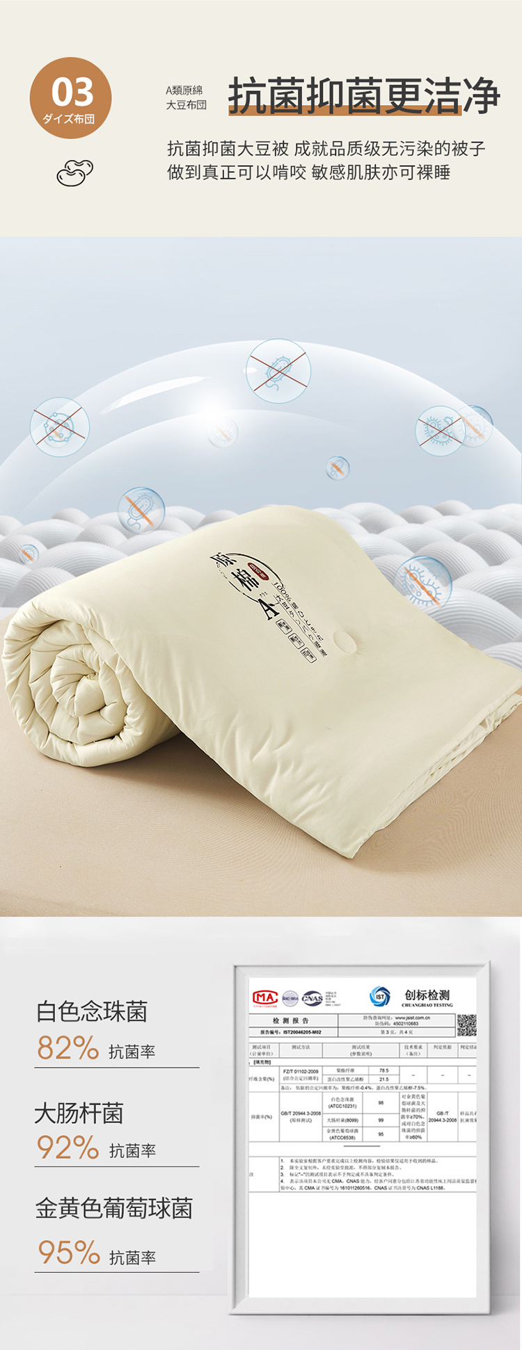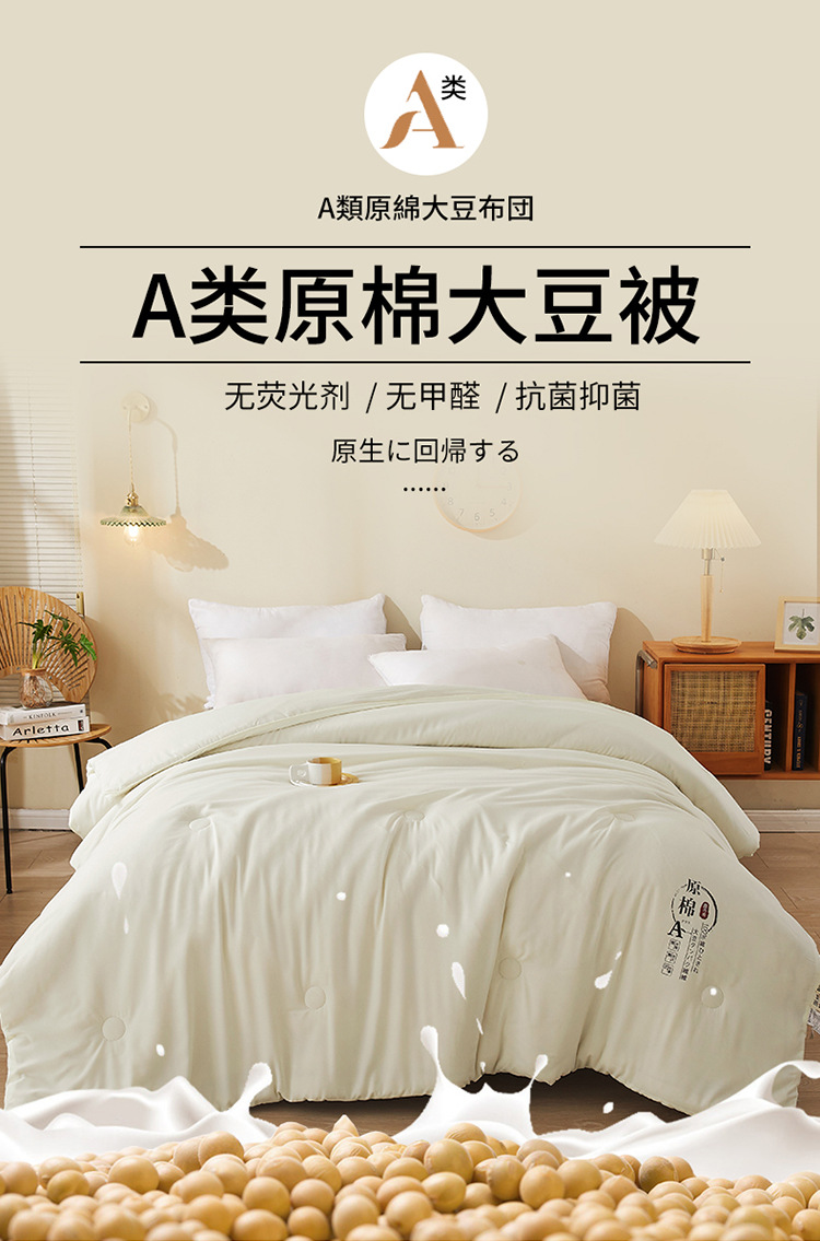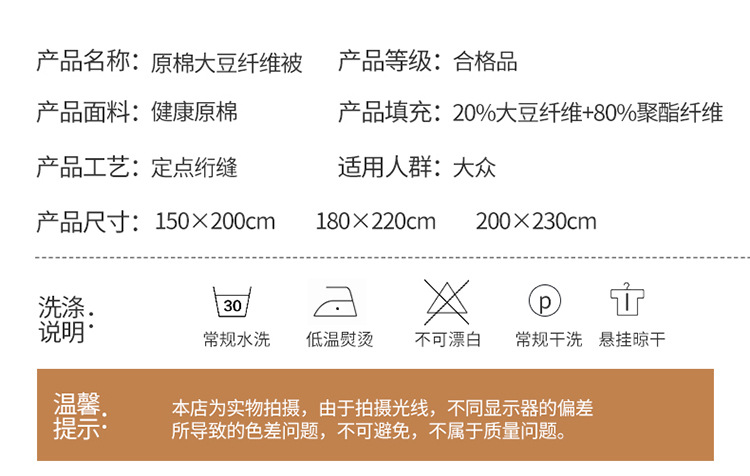 面料材质: 化纤 填充物: 大豆纤维 适用季节: 四季通用 品牌: -- 织造工艺: 绗缝 被子重量: 2斤(不含)-3斤(含) 货号: F769H7878JJ889-1 加工定制: 是 颜色: 米白色,灰色,粉红色,白色-A类抗菌大豆 尺寸规格: 120x150cm约2斤,150x200 是否一般纳税人: 否 重量: 5.0 kg/床