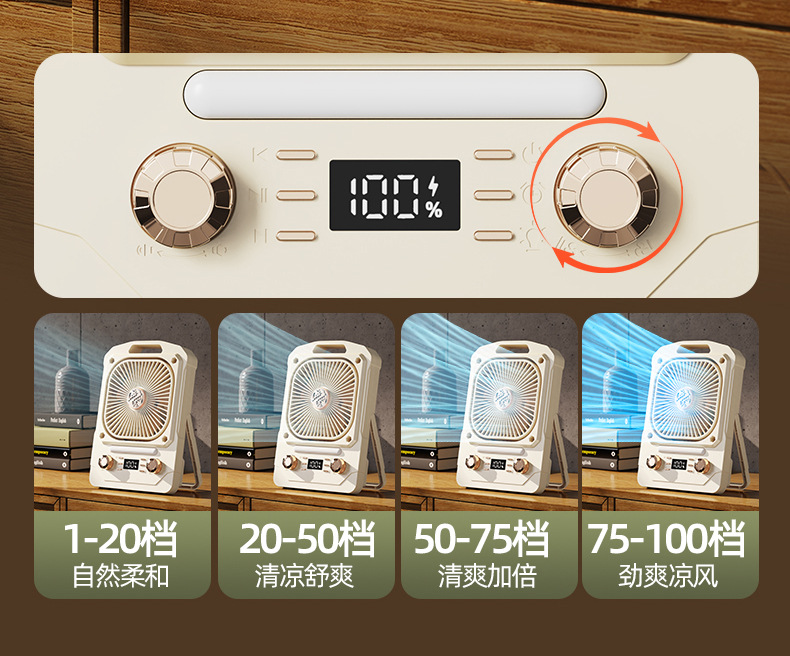 100档无极风速【按下-开关,然后转动旋转开关调节档位】