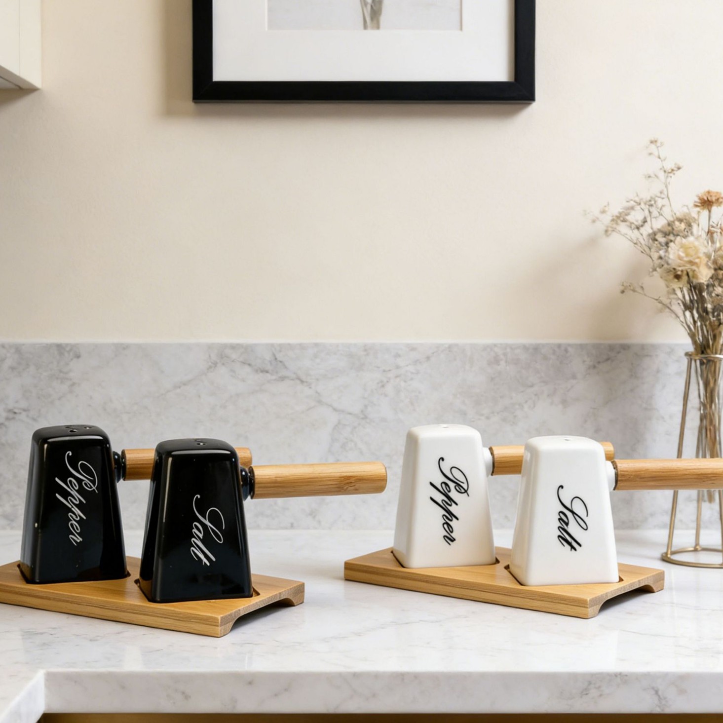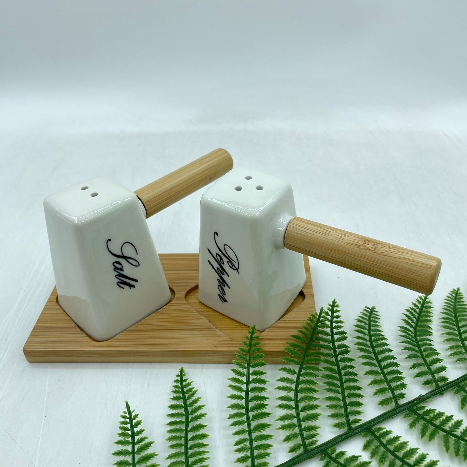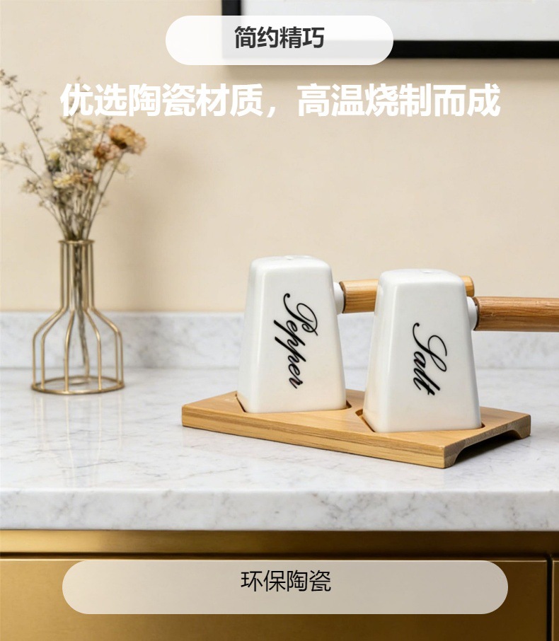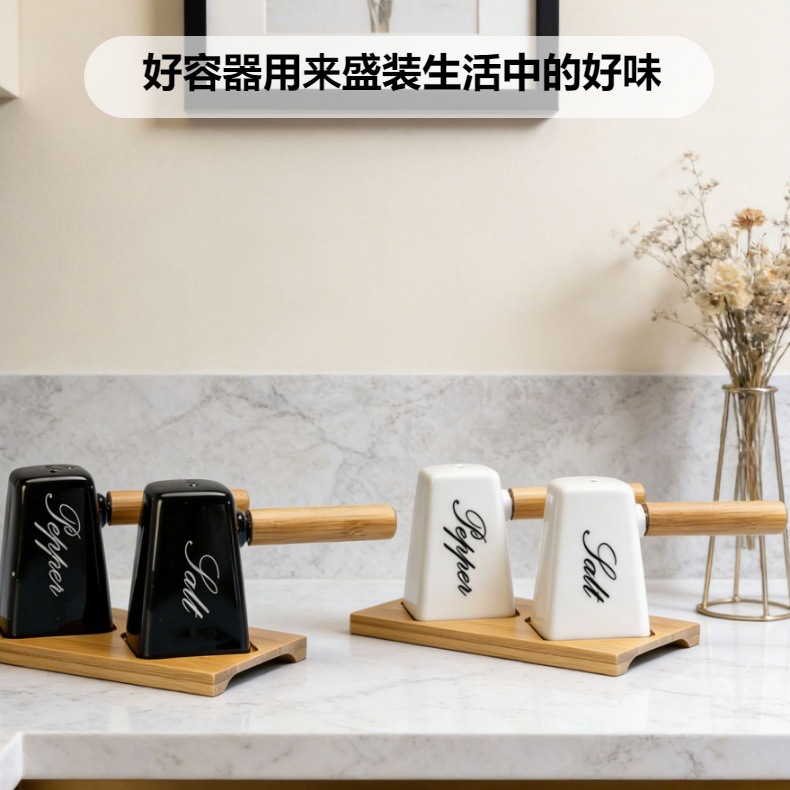 调味罐陶瓷盐瓶胡椒瓶带竹木底座调料罐调味盒厂家批发厨房味具