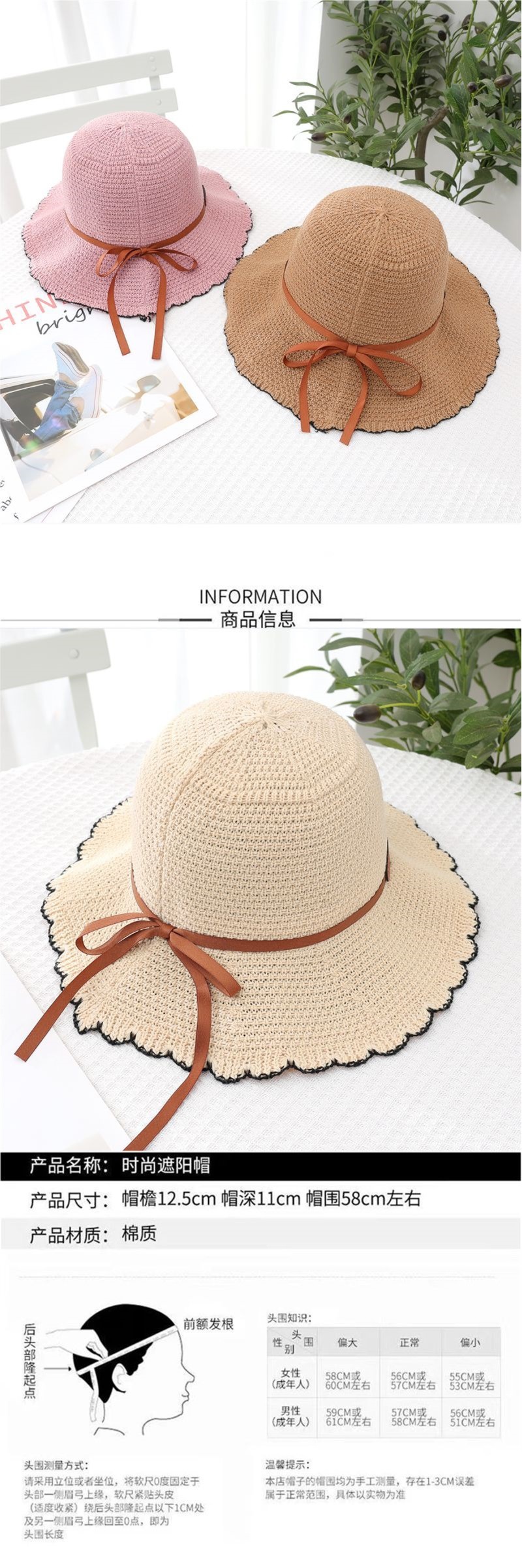 产品类别: 渔夫帽 功能: 防晒,透气,遮阳 面料名称: 涤纶 主面料成分: 涤纶(聚酯纤维) 处理工艺: 机绣 品牌: 艺可 风格: 韩式风 货号: 波浪边渔夫帽 适合季节: 夏季 产地: 河南 帽顶款式: 圆顶 帽檐款式: 短檐 上市年份/季节: 2025年春季 是否可调节: 不可调节 主面料成分含量: 96%以上 是否可折叠: 可折叠 风格分类: 清新甜美 流行元素分类: 无 重量: 0.5 kg/顶