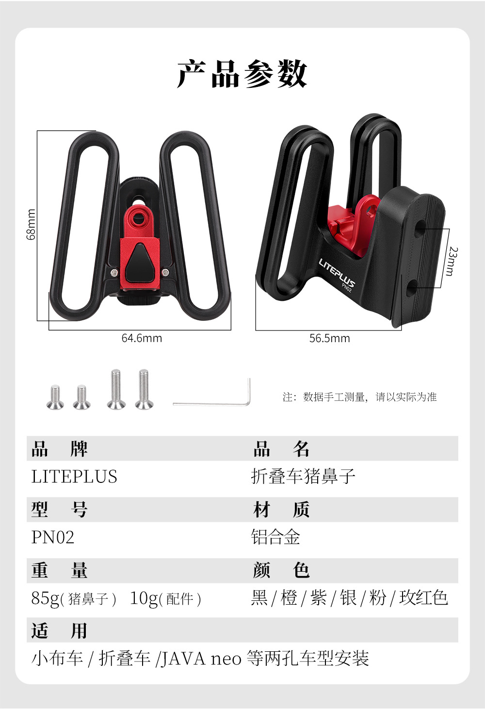 材质: 铝合金 品牌: LITEPLUS 型号: LITEPLUS-PNS02 产品编号: . 货号: LITEPLUS-PNS02猪鼻子 是否进口: 否 颜色: 黑色,玫红色,紫色,橙色,粉色,银色 主要销售地区: 欧洲,南美,东南亚,北美,东北亚,中东 有可授权的自有品牌: 是 是否跨境出口专供货源: 是 专利类型: 无 外贸出口认证: . 质检报告编号: . 重量: 0.001 kg/个
