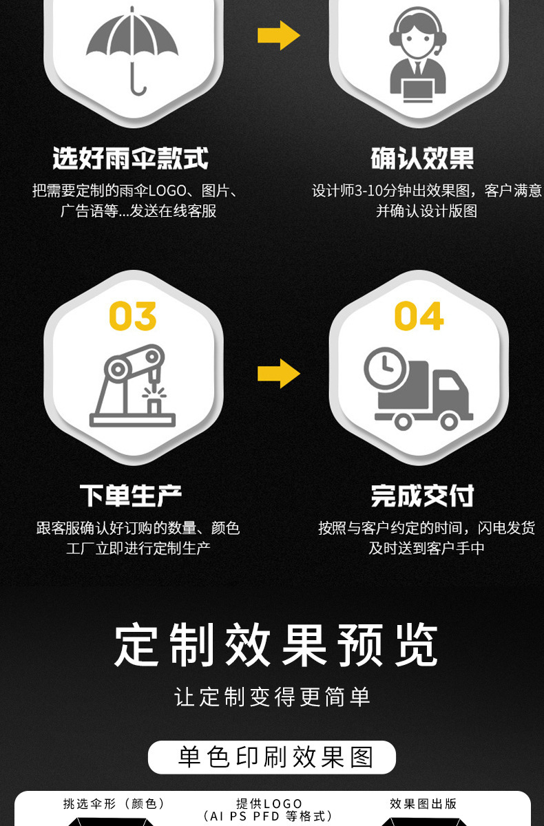 本公司专业定制各类广告伞,外贸伞,雨伞,折叠伞,晴雨伞,太阳伞,遮阳伞,自动伞,广告伞,高尔夫伞,直杆伞,长柄伞,迷你伞,儿童伞,数码印伞,酒瓶伞,拐杖伞,户外太阳伞,遮阳伞,沙滩伞,大伞固定底座,四角帐篷,折叠帐篷,旅游帐篷,雨衣等产品。 量大从优!!!