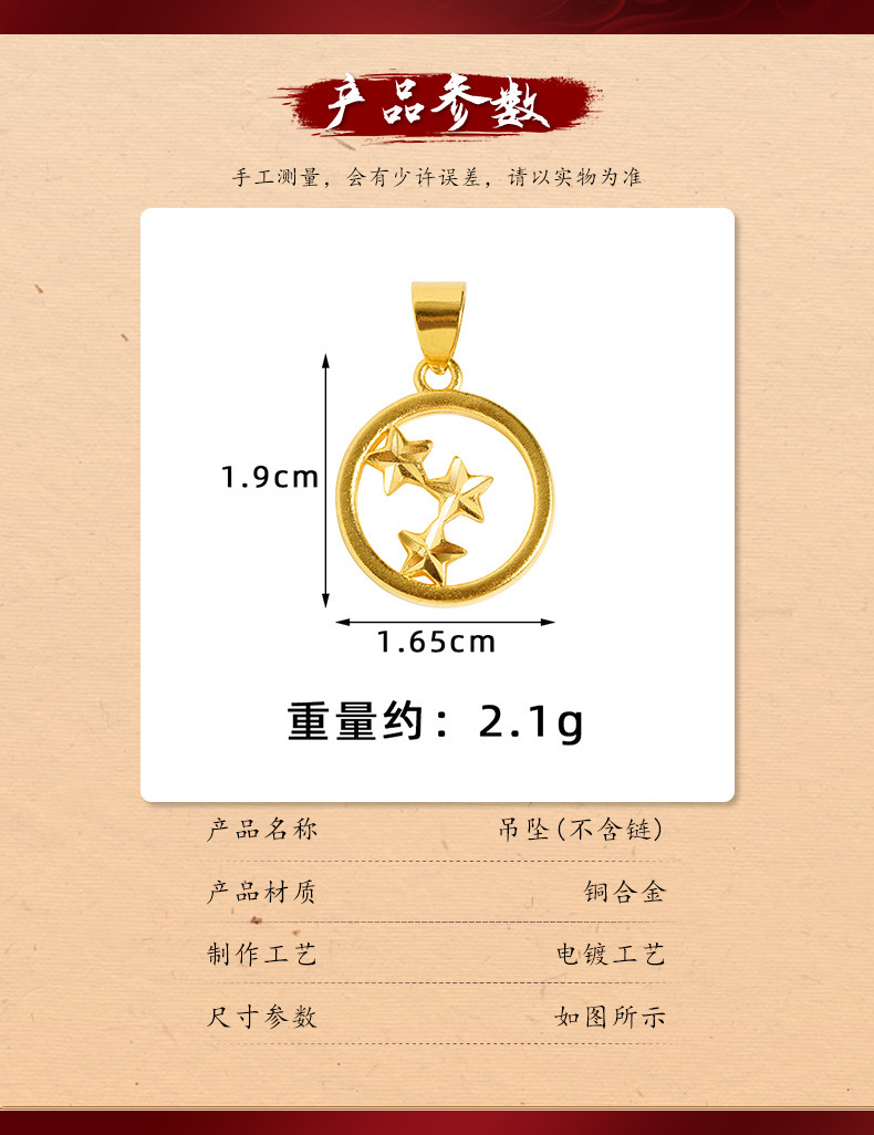 材质: 铜 处理工艺: 电镀 品牌: 无 流行元素: 星星 风格: ins风 造型: 观音 货号: D2394 产地: 金华 主要下游平台: wish,快手,SHEIN,速卖通,天猫 颜色: D2394 简约星星吊坠 有可授权的自有品牌: 否 是否跨境出口专供货源: 是 上市年份/季节: 2024年夏季 风格分类: 个性风潮 主要销售地区: 非洲,欧洲,南美,东南亚,北美,东北亚, 流行元素分类: 自然 重量: 0.04 kg/个