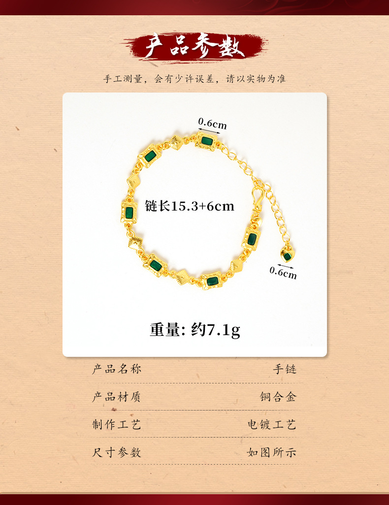 材质: 铜 品牌: 无 处理工艺: 电镀 风格: 中国风 适用人群: 女式 样式: 女式 造型: 其他 适用送礼场合: 员工福利 货号: S2851 产地: 金华 主要下游平台: wish,快手,SHEIN,速卖通,天猫 颜色: S2851 方包玉髓手链 有可授权的自有品牌: 否 是否跨境出口专供货源: 是 流行元素: 四边形 上市年份/季节: 2024年夏季 风格分类: 文艺复古 主要销售地区: 非洲,欧洲,南美,东南亚,北美,东北亚, 流行元素分类: 几何 重量: 0.04 kg/条