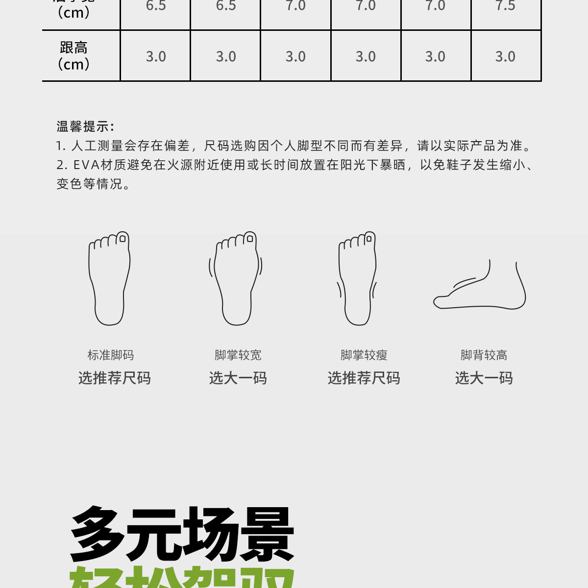 7:温馨提示:EVA材质拖鞋需避免高温暴晒,长时间高温会导致鞋子产生变形。