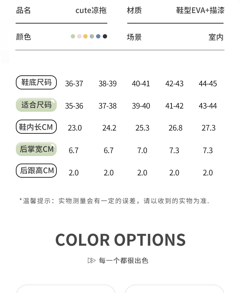 7:温馨提示:EVA材质拖鞋需避免高温暴晒,长时间高温会导致鞋子产生变形。