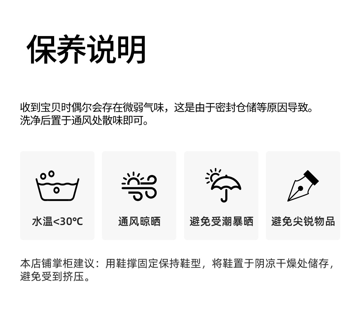 3:气味问题:本店为厂家直销,新生产的鞋子密封包装极个别会带气味,无关质量,放置阴 凉通气处气味会散去。