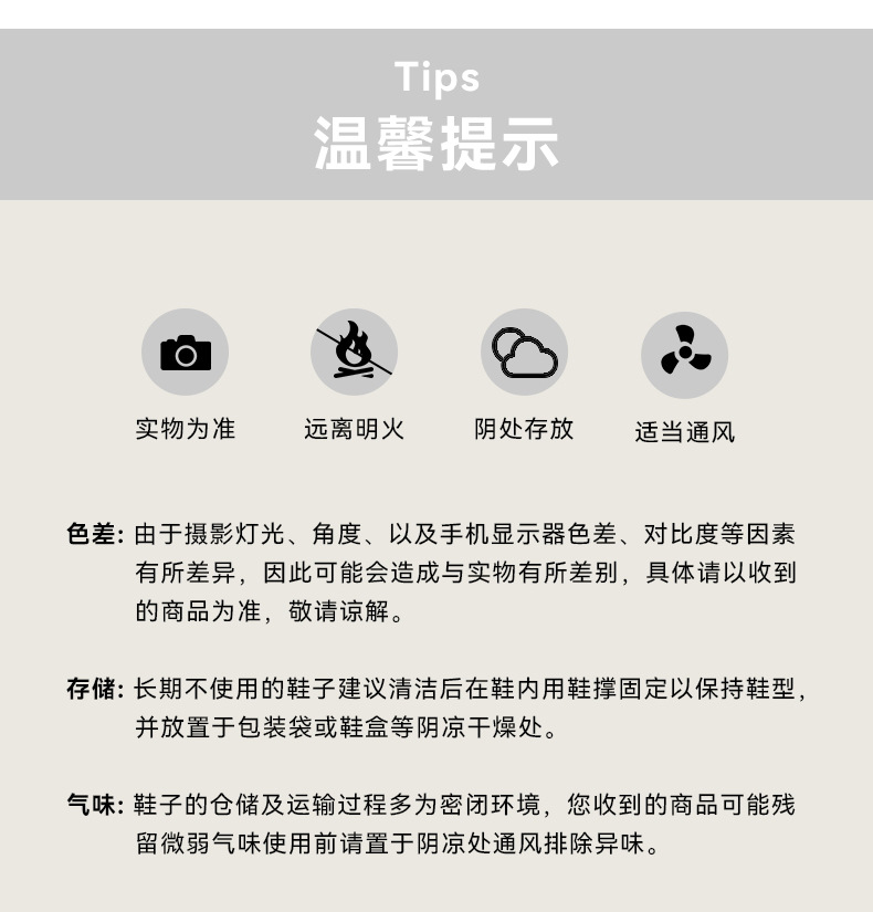 气味问题:本店为厂家直销,新生产的鞋子会有些胶水气味,无关质量,放置阴凉通气处 气味将会消散。