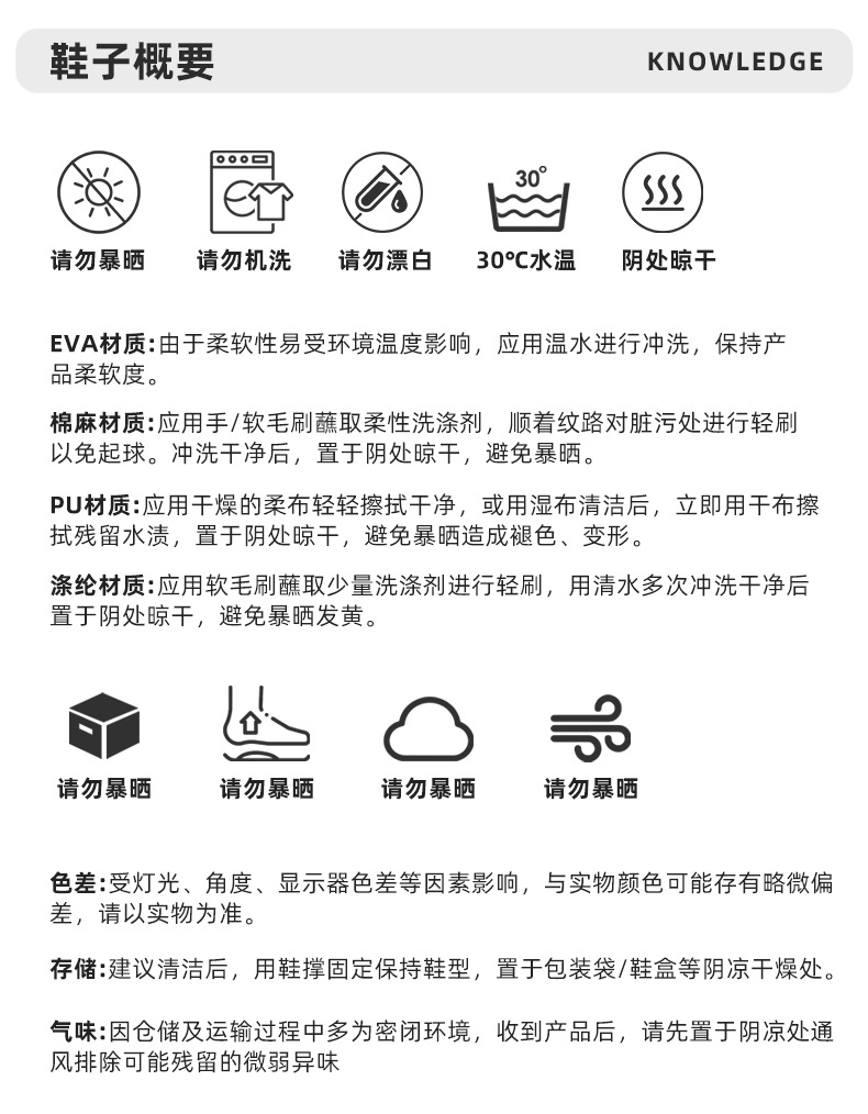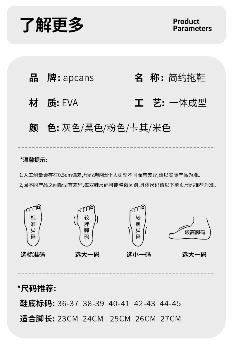 温馨提示:EVA材质拖鞋需避免高温暴晒,长时间高温会导致鞋子产生变形。