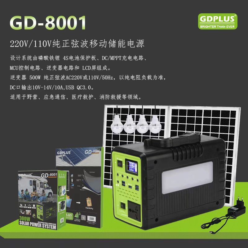 蓄电池容量: 750 产地: 浙江东阳 光电板功率: 75 产品认证: 无 主机输出容量: 300 输出频率: 50-60 品牌: GD-PLUS 外型尺寸: 28*13*19cm 适用范围: 家用 户外 型号: GD-8001 货号: GD-8001 重量: 0.3 kg/个