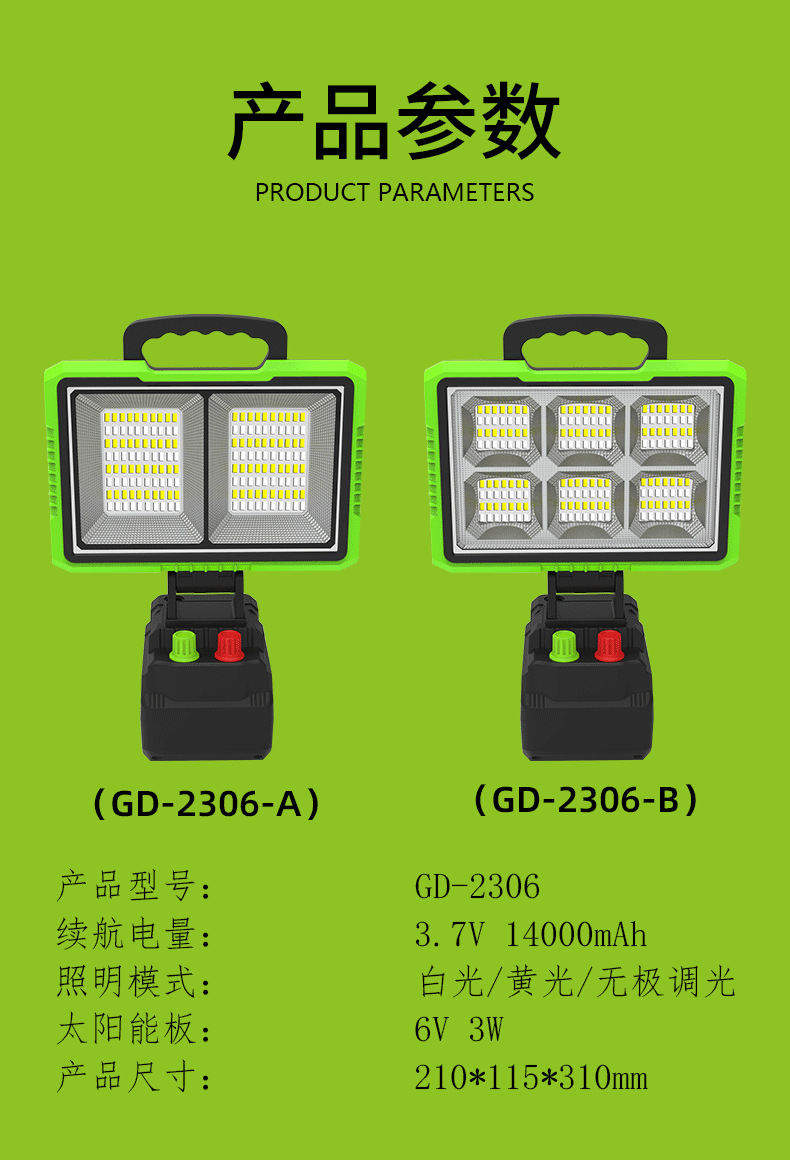防护等级: IP65 开关类型: 手动 品牌: 赛业电子 光源类型: LED 连续照明时间: 6小时(含)-12小时(不含) 外形尺寸: 21*11.5*21 认证: 无 额定功率: 700 产地: 浙江东阳 是否进口: 否 货号: GD-2306 型号: GD-2306A-2306B 规格分类: GD-2306A,GD-2306B 电压: 3.7 寿命: 10000 是否跨境出口专供货源: 否 风格: 欧式 灯珠品牌: 无 是否一般纳税人: 是 是否有专利: 否 重量: 0.3 kg/只