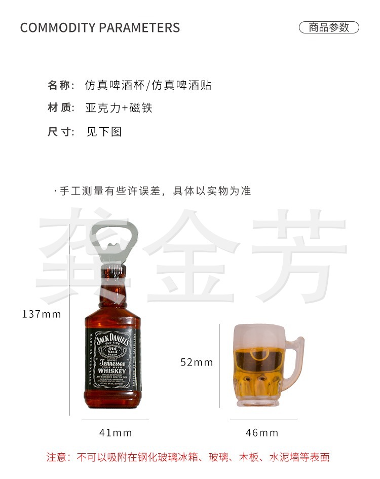 【产品介绍】1:名称:开瓶器2:材质:亚克力+镀锡金属+磁铁3:尺寸: 宽3.8CM,高10.5CM4:颜色:图片色5:包装:单个产品OPP袋,40个产品一中盒,480个整箱