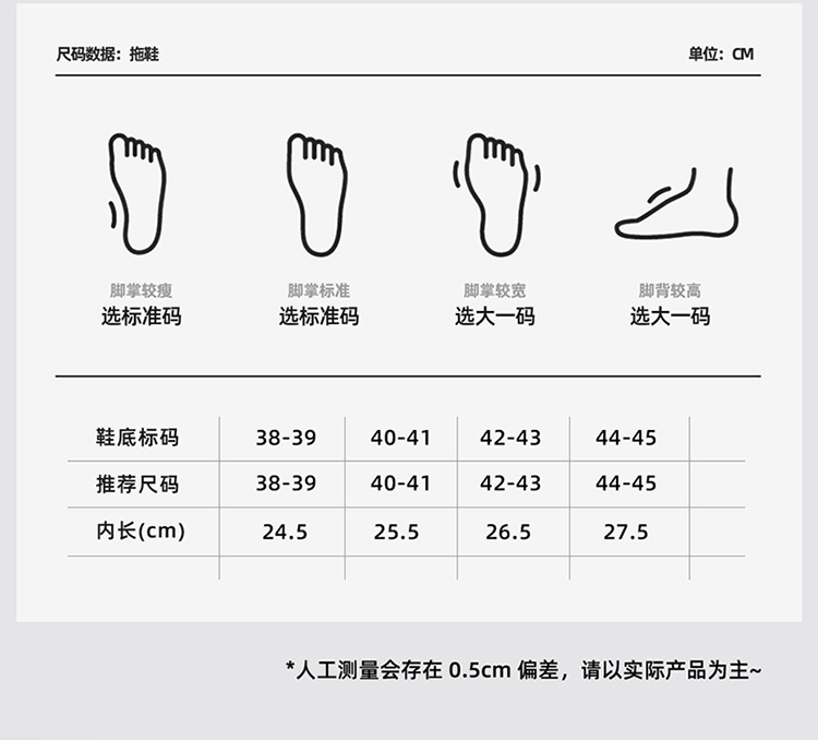 尺码问题:拖鞋偏小一点(卡码,脚宽,脚胖建议选大一码),拍前可联系客服。