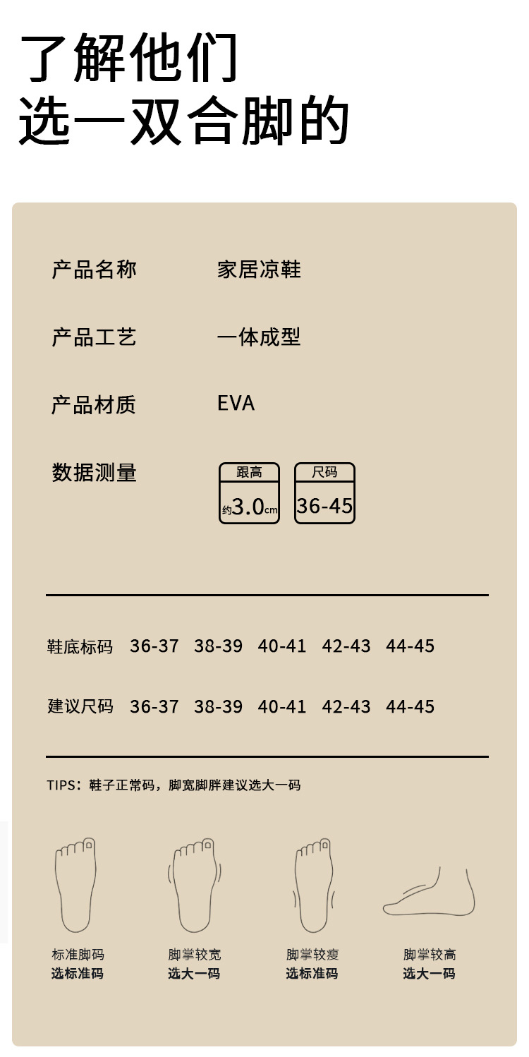 温馨提示:EVA材质拖鞋需避免高温暴晒,长时间高温会导致鞋子产生变形。