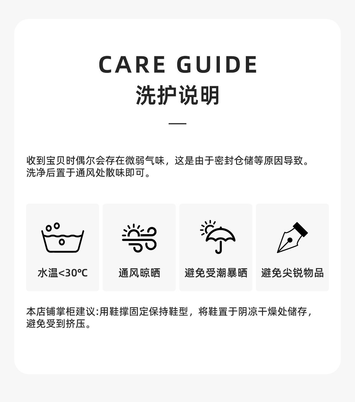 气味问题:本店为厂家直销,新生产的鞋子密封包装极个别会带气味,无关质量, 放置阴凉通气处气味会散去。