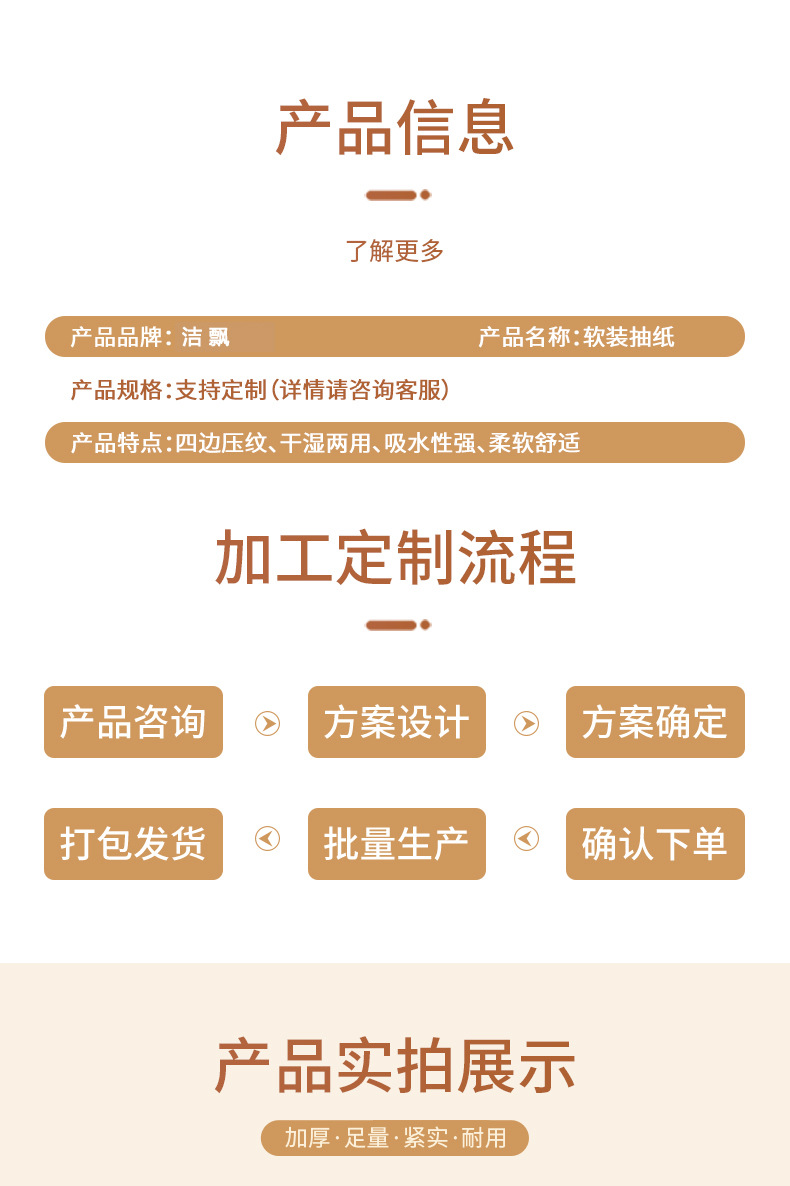 品牌: 无 材质: 木浆 层数: 四层 张数: 320 商品条形码: 00000000 重量: 100 产品规格: 四层80抽,五层70抽 产地: 安徽 加工定制: 否 克重: 100 面巾纸种类: 抽取式卫生纸 重量: 0.165 kg/包