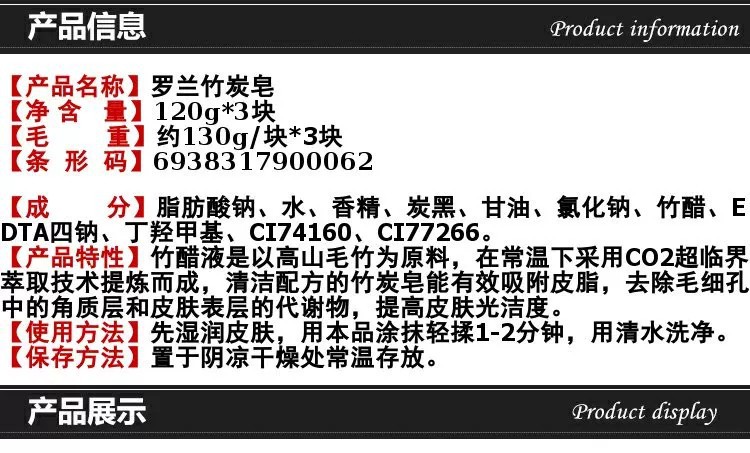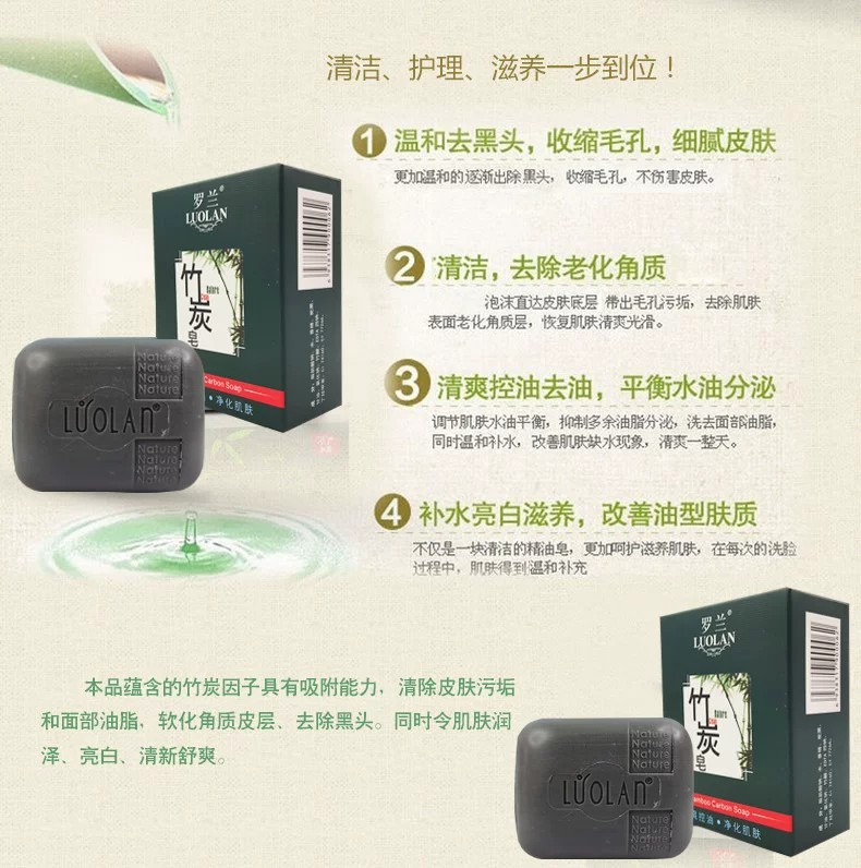 品牌: LUOLAN/罗兰 适用肤质: 油性 香皂类型: 润肤皂 功效: 深层清洁 香型: 其它 原料成分: 竹炭 规格类型: 正常规格 保质期: 三年 是否进口: 否 品牌类型: 国产品牌 商品条形码: 6938317900062 货号: 6938317900062 适用人群: 成人 是否跨境出口专供货源: 否 净含量: 罗兰竹炭皂120g 是否量贩装: 否 包装种类: 基础包装 重量: 0.416 kg/块