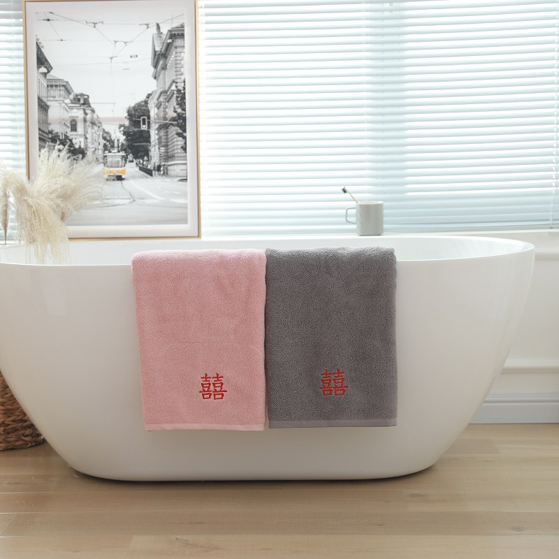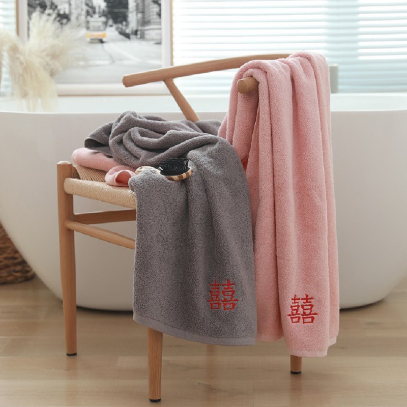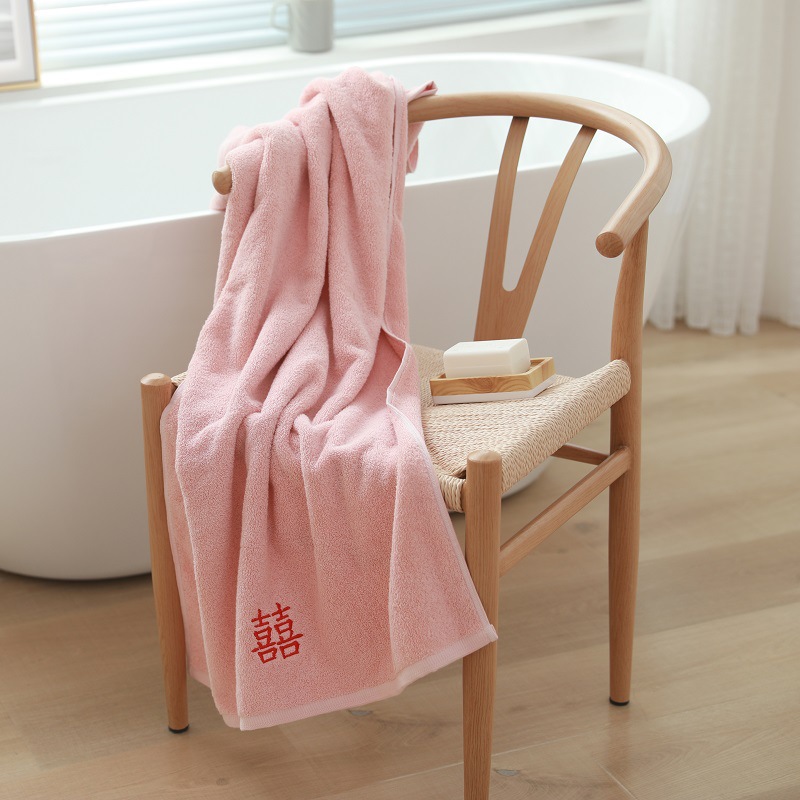 厂家直销纯棉浴巾素色刺绣喜字礼品赠送婚庆回礼澡巾可批发