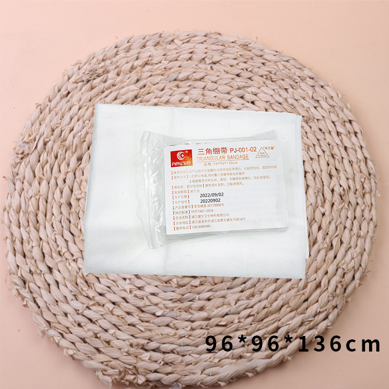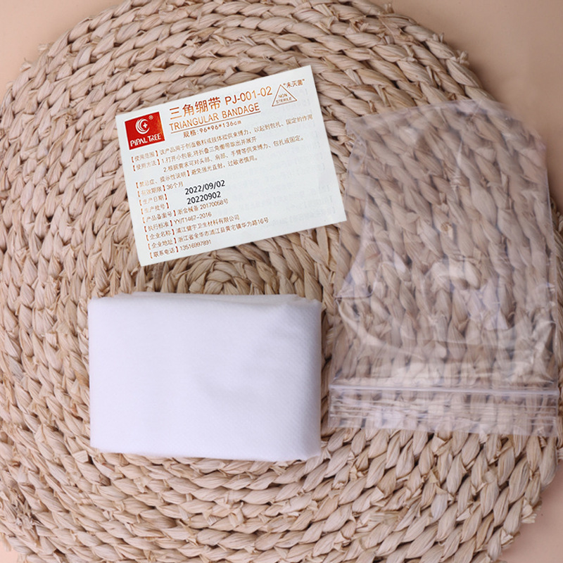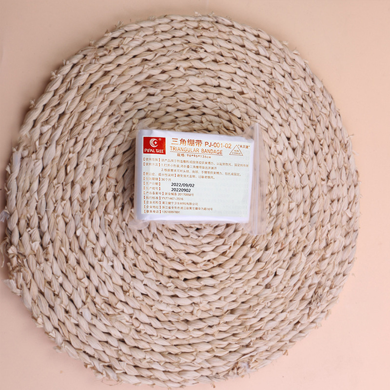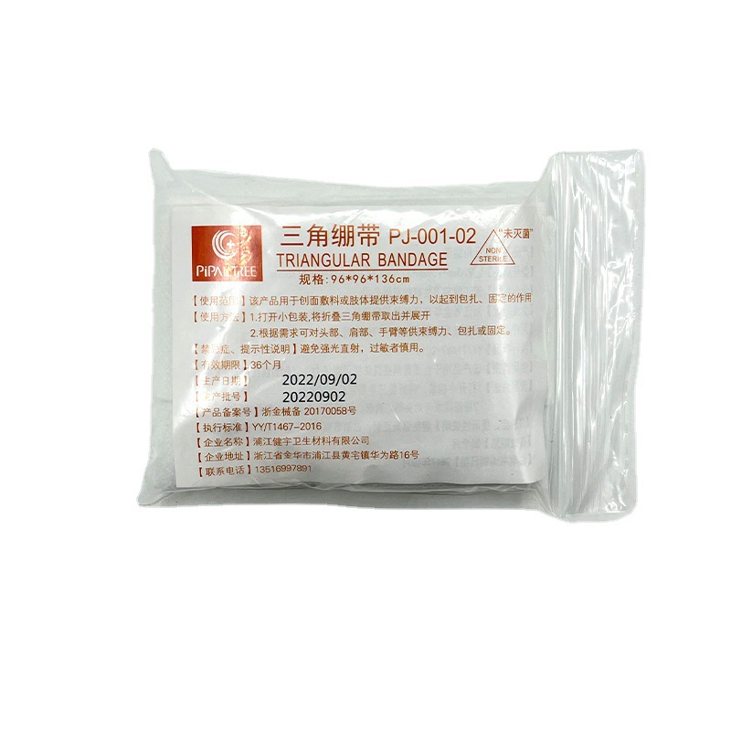 【适 用 性】三角绷带主要用于手臂吊悬,夹板绑扎,或头部包扎。特别适用于包扎多种大面积伤口、人体不规则部位伤口,是适用面很广的包扎敷料。经过专业急救培训或者包扎技术培训的急救员几乎可以用它来包扎人体任何部位的伤口,所以几乎所有的急救包都配备有三角绷带。