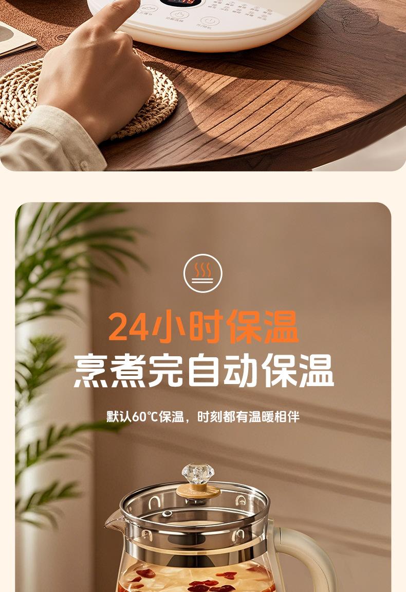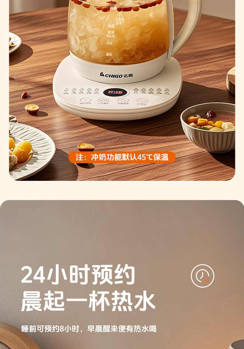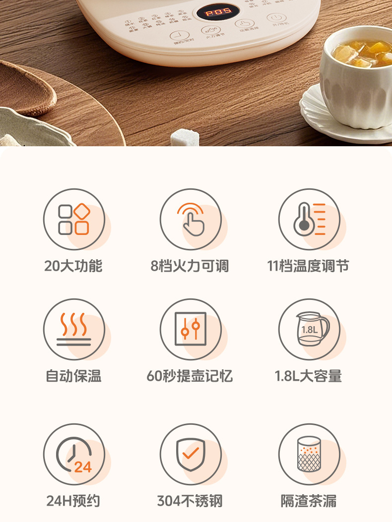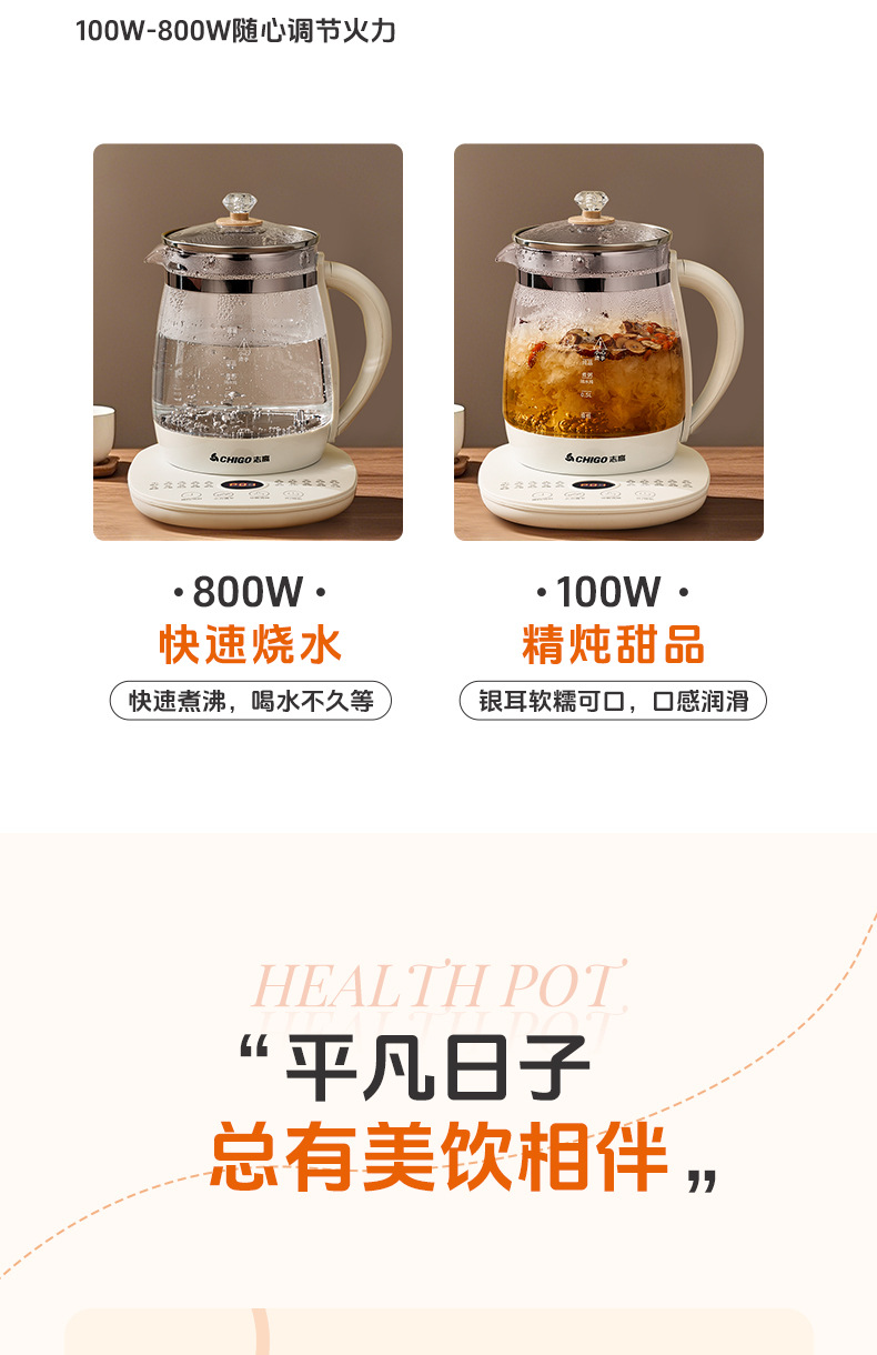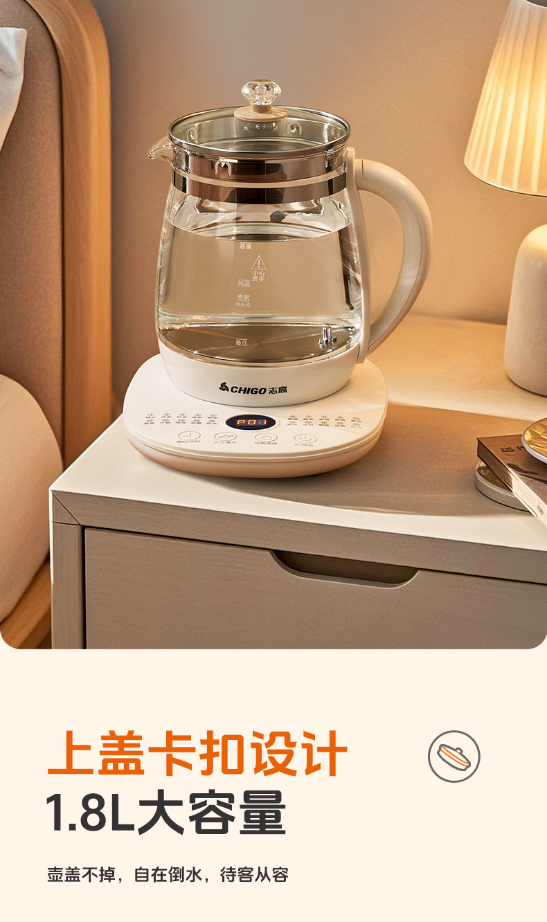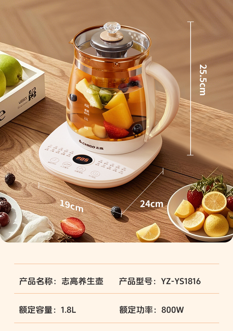 控制方式: 触摸式 品牌: Chigo/志高 容量: 1.5—2L(含) 内胆材质: 玻璃 机身材质: 高硼硅玻璃 附加功能: 保温,预约,防干烧 产品类别: 养生壶 额定电压: 220V 型号: YZ-YS1816 货号: YZ-YS1816 额定功率: 500—1000w 3C证书编号: 2024190717010166 上市时间: 2025 售后服务: 店铺三包 外壳工艺: 其他 适用人数: 2-3人 额定频率: 50 包装清单: 其他 颜色: 白色单机款1.8L,白色滤网款1.8L 温控器系列: 电子式温控器 重量: 0.227 kg/台