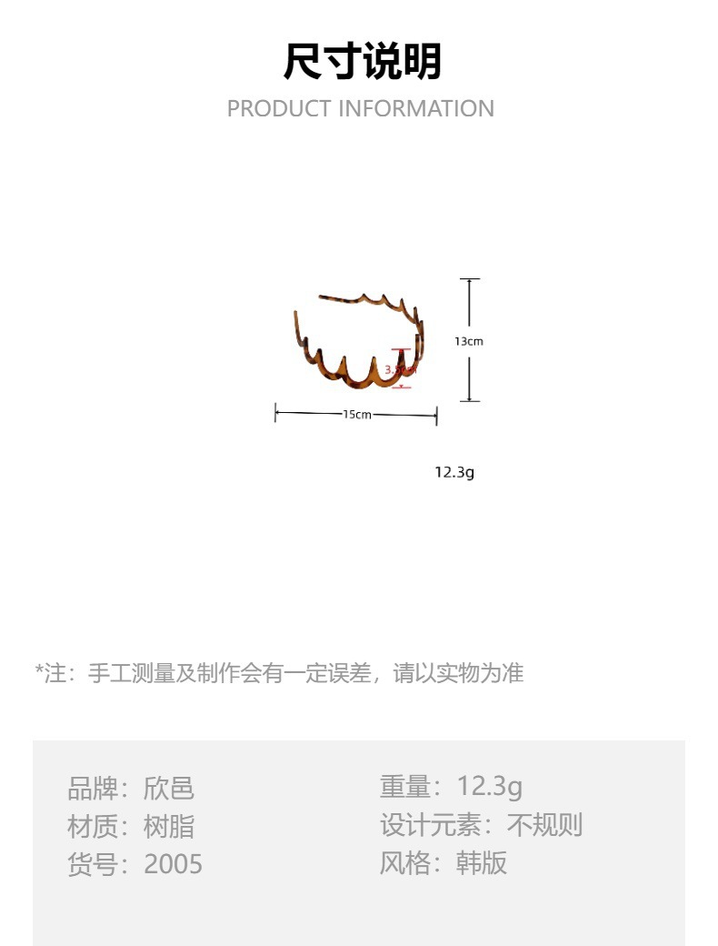 材质: 塑料/树脂 处理工艺: 手工 流行元素: 花纹 品牌: 其他 风格: 韩版韩式 适用人群: 女式 上市年份/季节: 2024年夏季 货号: 发箍 产地: 义乌 主要下游平台: LINIO,SHEIN,速卖通,天猫,独 颜色: 黑色,琥珀 有可授权的自有品牌: 是 是否跨境出口专供货源: 否 风格分类: 清新甜美 镶嵌材质: 非镶嵌 流行元素分类: 自然 重量: 0.02 kg/个