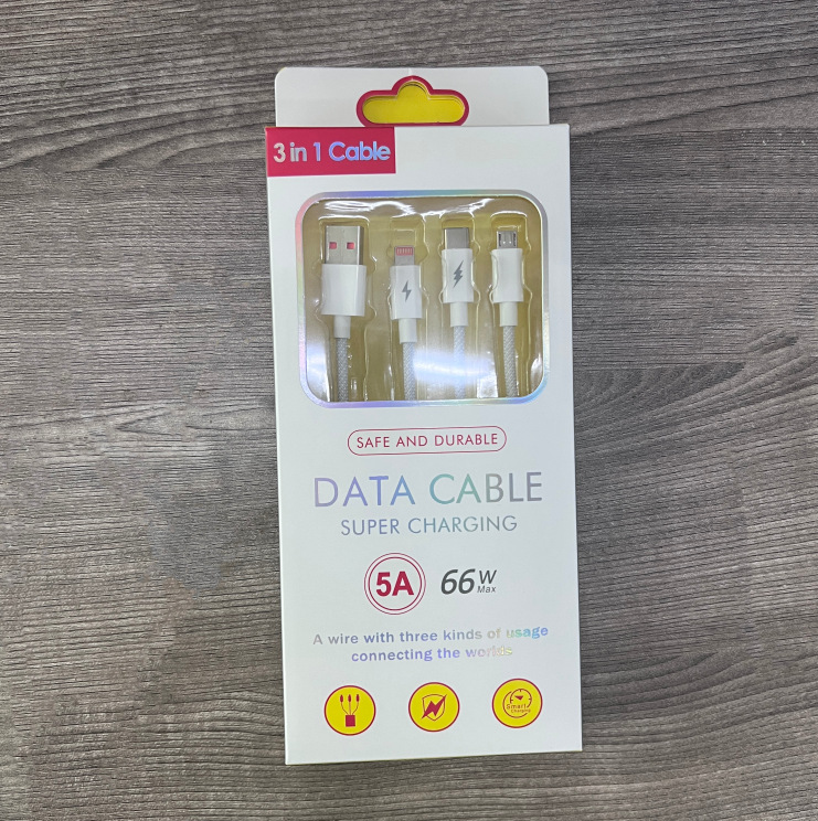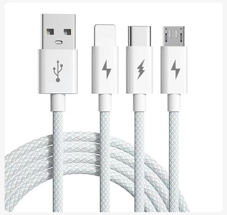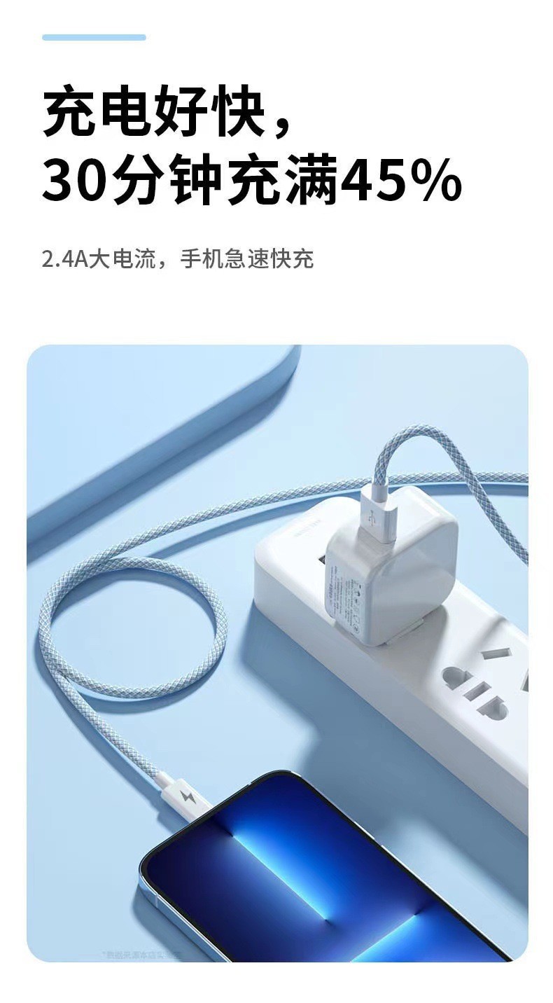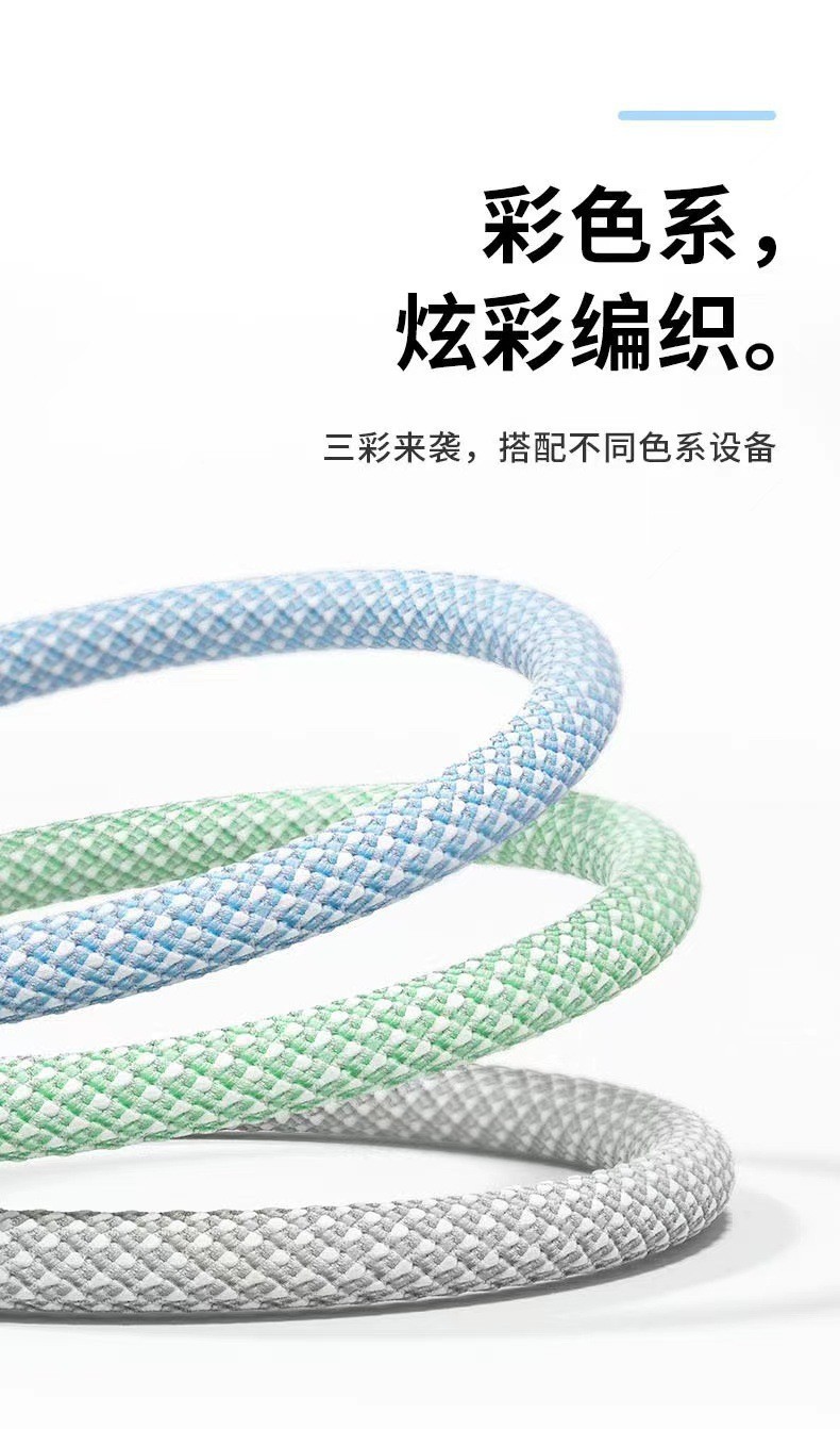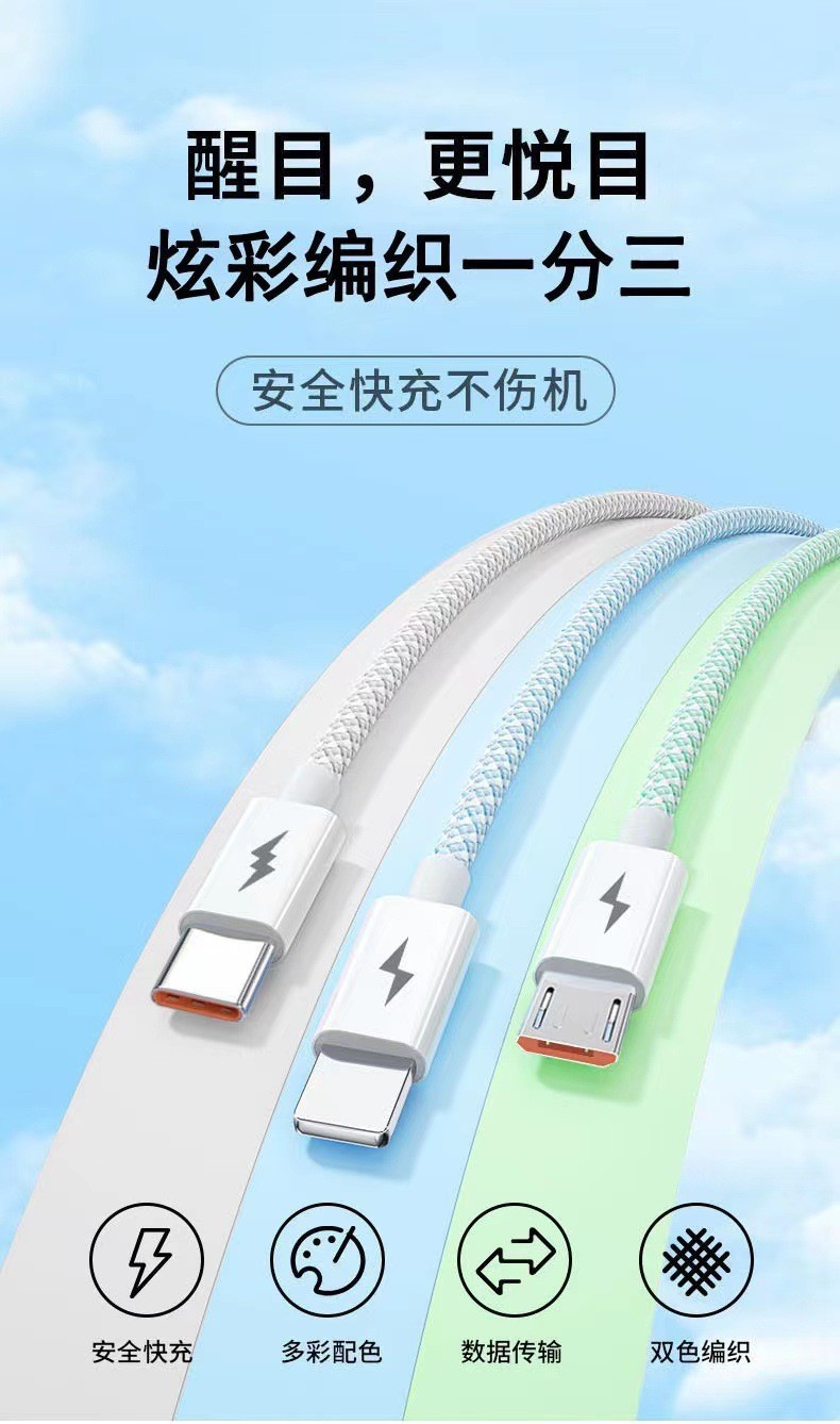 产品亮点:3A快充,一线三充,炫彩编织,接口加固防断裂,Type-c接口支持数据传输