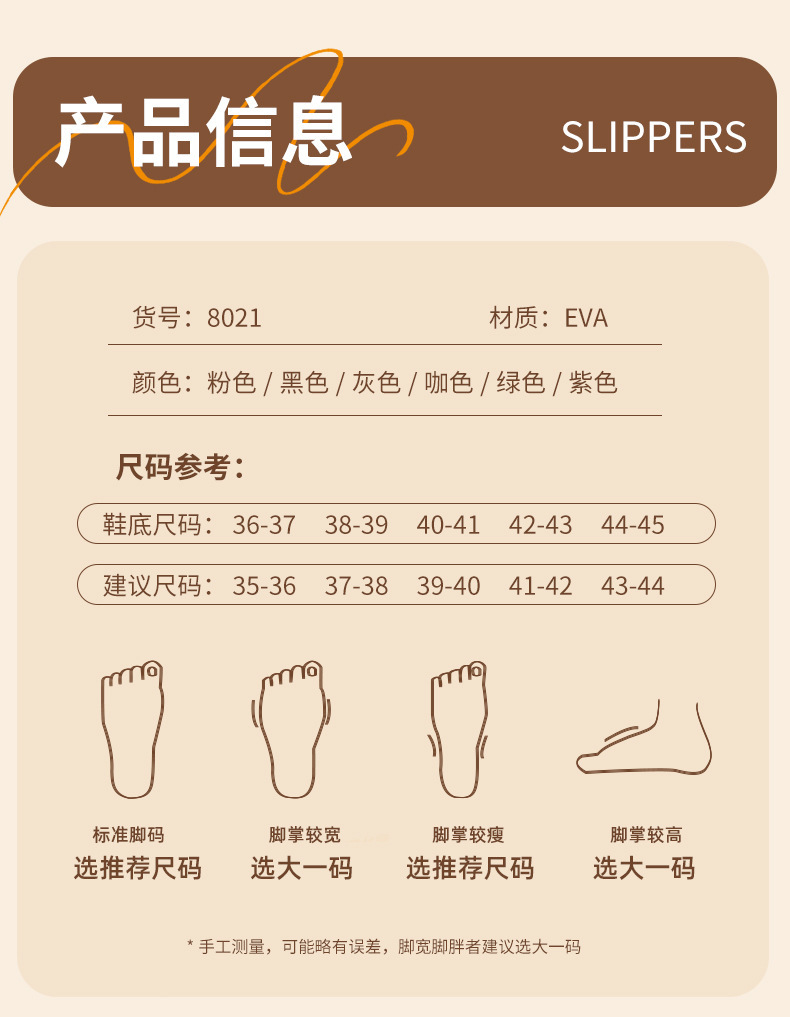 尺码问题:拖鞋偏小一点(卡码,脚宽,脚胖建议选大一码),拍前可联系客服。
