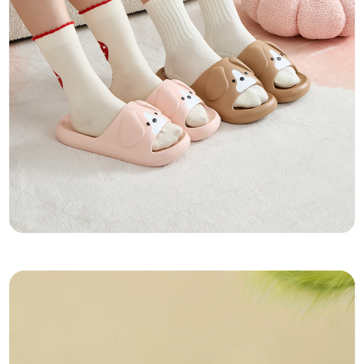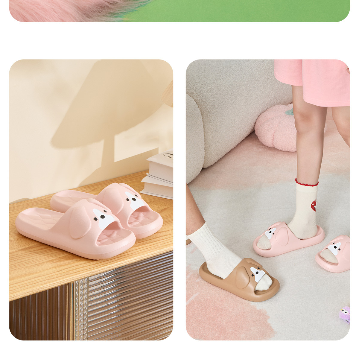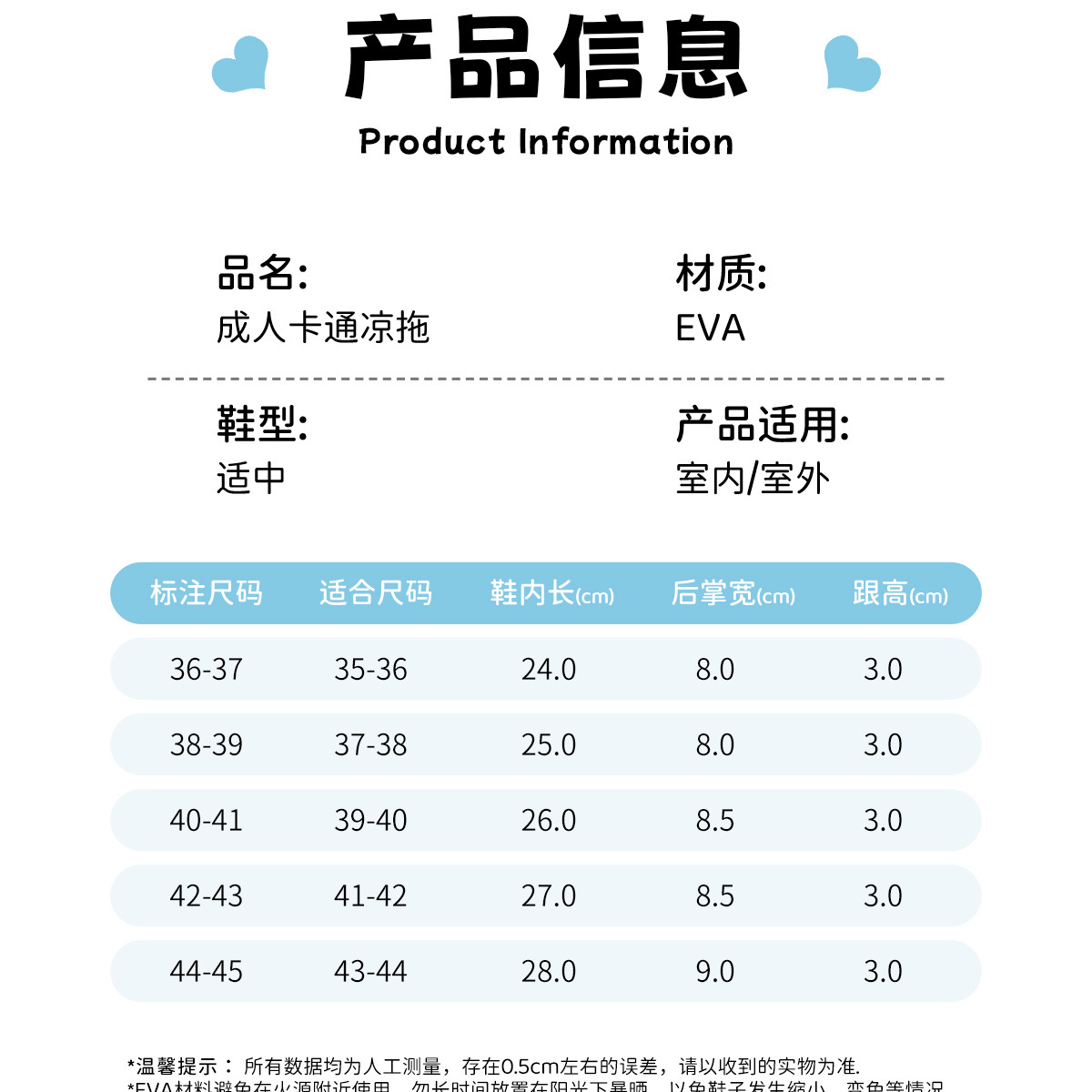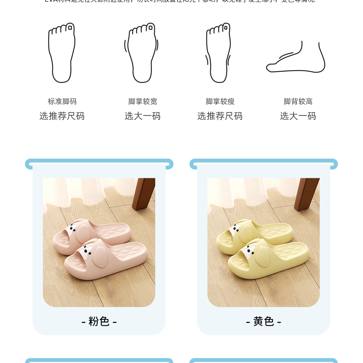 温馨提示:EVA材质拖鞋需避免高温暴晒,长时间高温会导致鞋子产生变形。