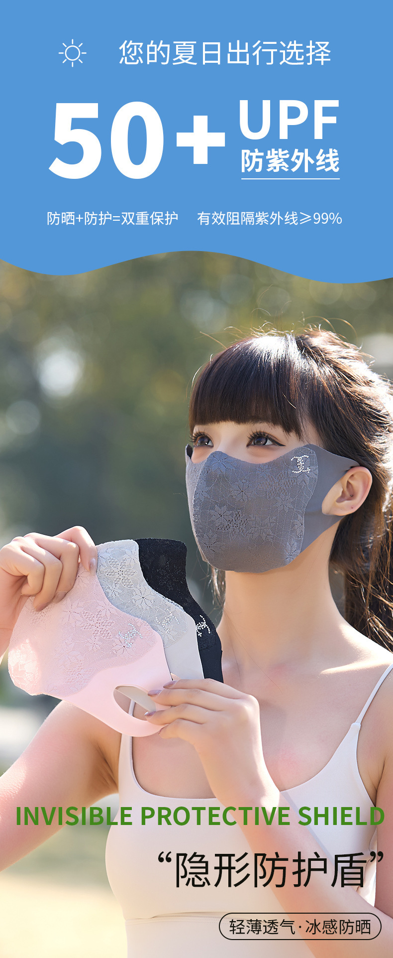 夏季防晒口罩女高颜值护眼角薄款透气个性拼接网纱户外防紫外线 投诉