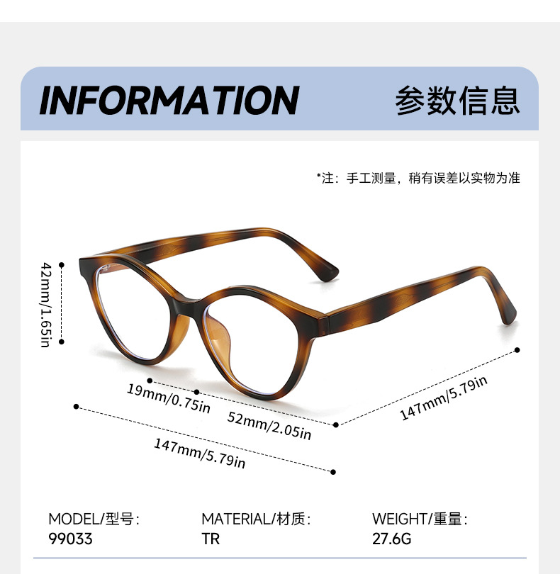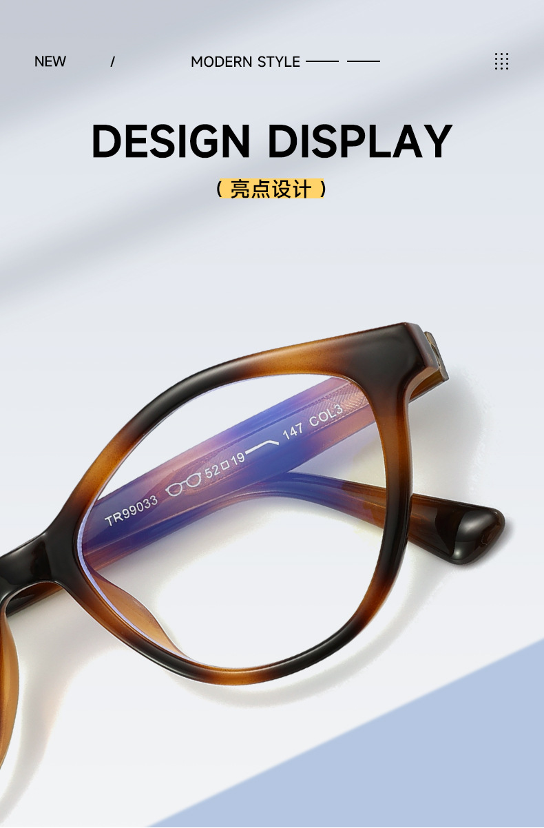 镜框材质: TR90 镜架材质: TR90 镜片材质: AC 产品类别: 平光镜 镜片功能: 防蓝光 眼镜结构: 全框架 是否支持近视镜: 是 流行元素: 眼镜 上市年份/季节: 2026春季 是否跨境出口专供货源: 是 货号: 99033 镜框颜色: 亮黑框,蓝变紫框,茶玳瑁框,浅茶框,茶粉 适用人群: 成人 产地: 台州 风格: 时尚百搭,休闲风,运动风,chic风 眼镜款式: 全框 风格分类: 时尚通勤 适合脸型: 方脸 主要销售地区: 南美,东南亚,中东 重量: 0.029 kg/副