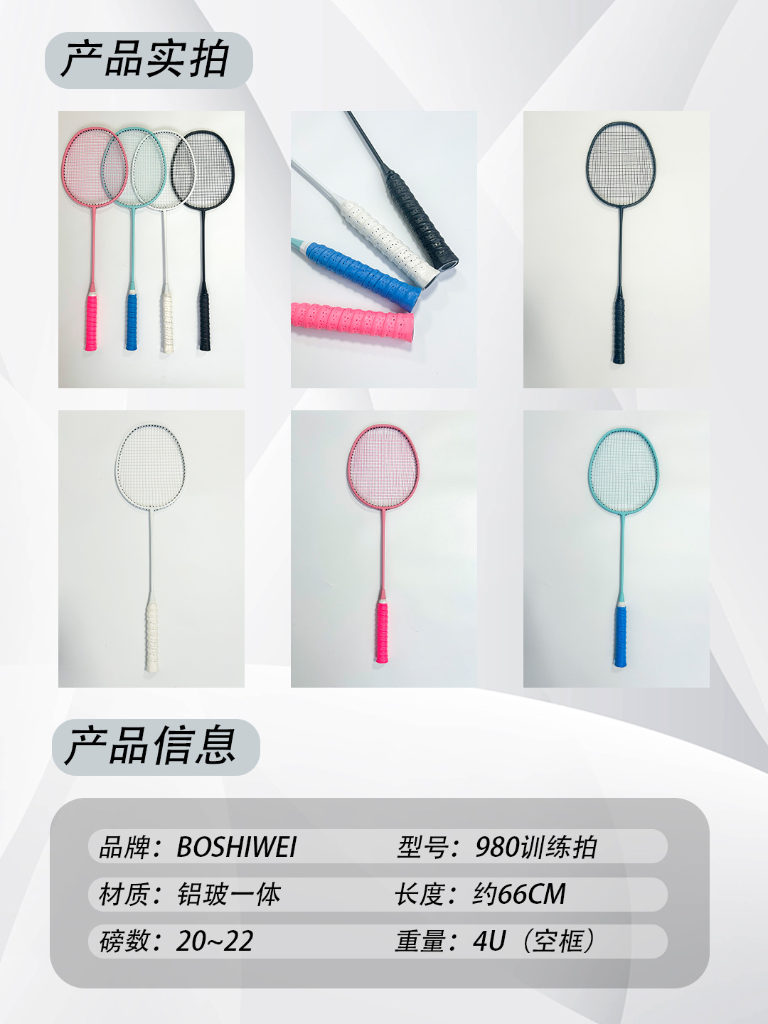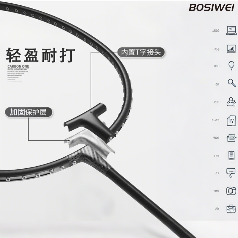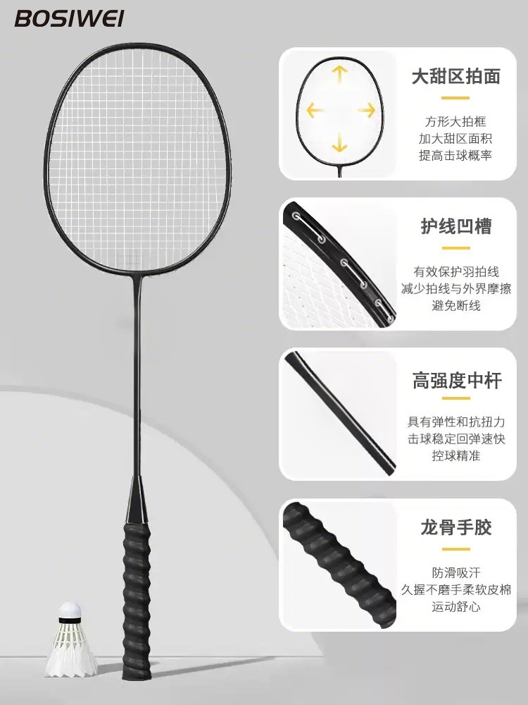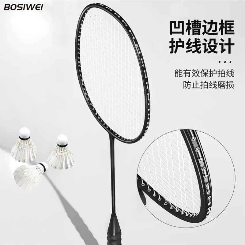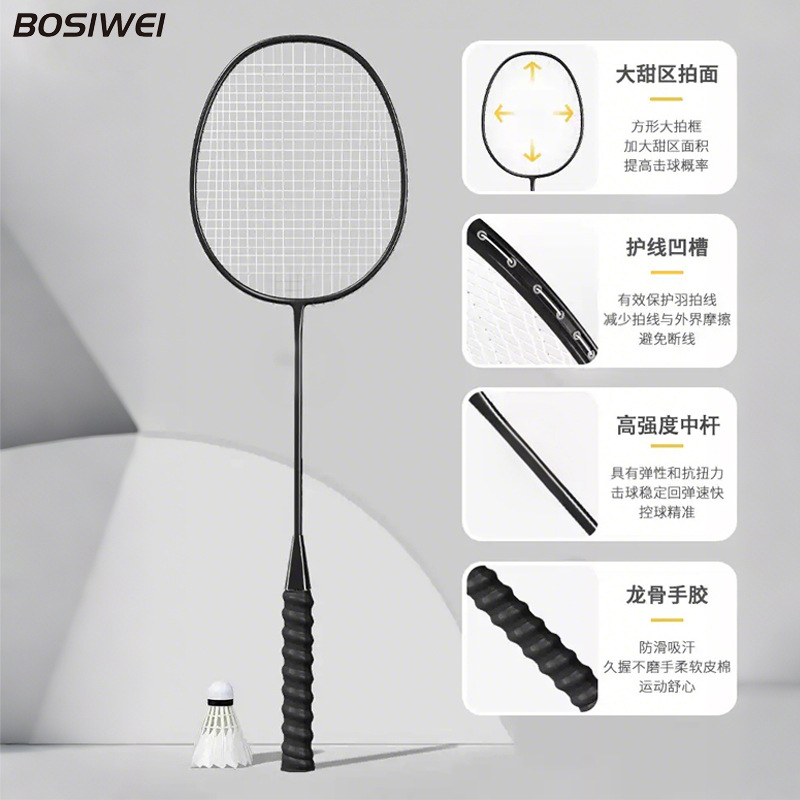品牌: BOSIWEI 框架材质: 碳铝合金 产品类别: 羽毛球拍 网线材质: 纤维丝 球拍类型: 直拍 重量: 85g(含)-89g(含) 拍杆硬度: 硬 规格: 标准 货号: 980 产地: 浙江 加工定制: 是 加印LOGO: 可以 适用对象: 业余初中级 拍柄粗细: G2 适用场景: 乒羽网球运动,其他球类运动 颜色: 黑色,白色,天蓝色,粉红色 是否跨境出口专供货源: 否 儿童专用: 否 专利类型: 无 上市年份季节: 2025年冬季
