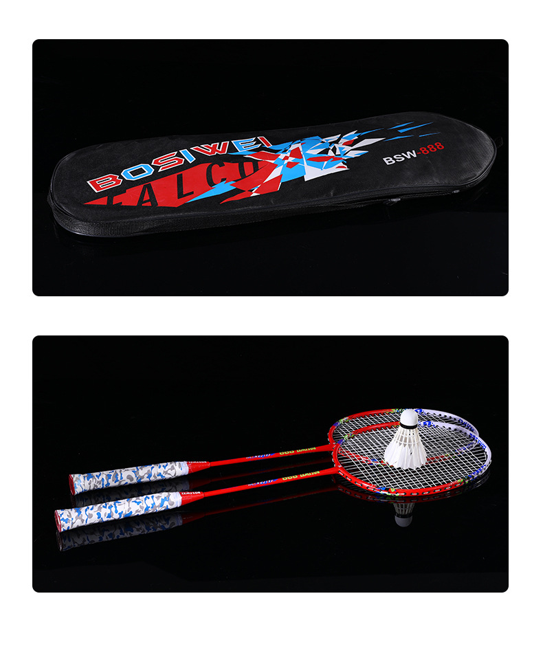品牌: 酷步 框架材质: 钢 产品类别: 羽毛球拍 网线材质: 锦纶 球拍类型: 直拍 重量: 95g(含)-100g(含) 拍杆硬度: 适中 货号: 888 产地: 浙江衢州 加工定制: 是 加印LOGO: 可以 适用对象: 都适用 拍柄粗细: G1 适用场景: 跑步运动,健身器材,乒羽网球运动 颜色: 红色/2支装+拍包,蓝色/2支装+拍包, 是否跨境出口专供货源: 否 儿童专用: 是 专利类型: 无