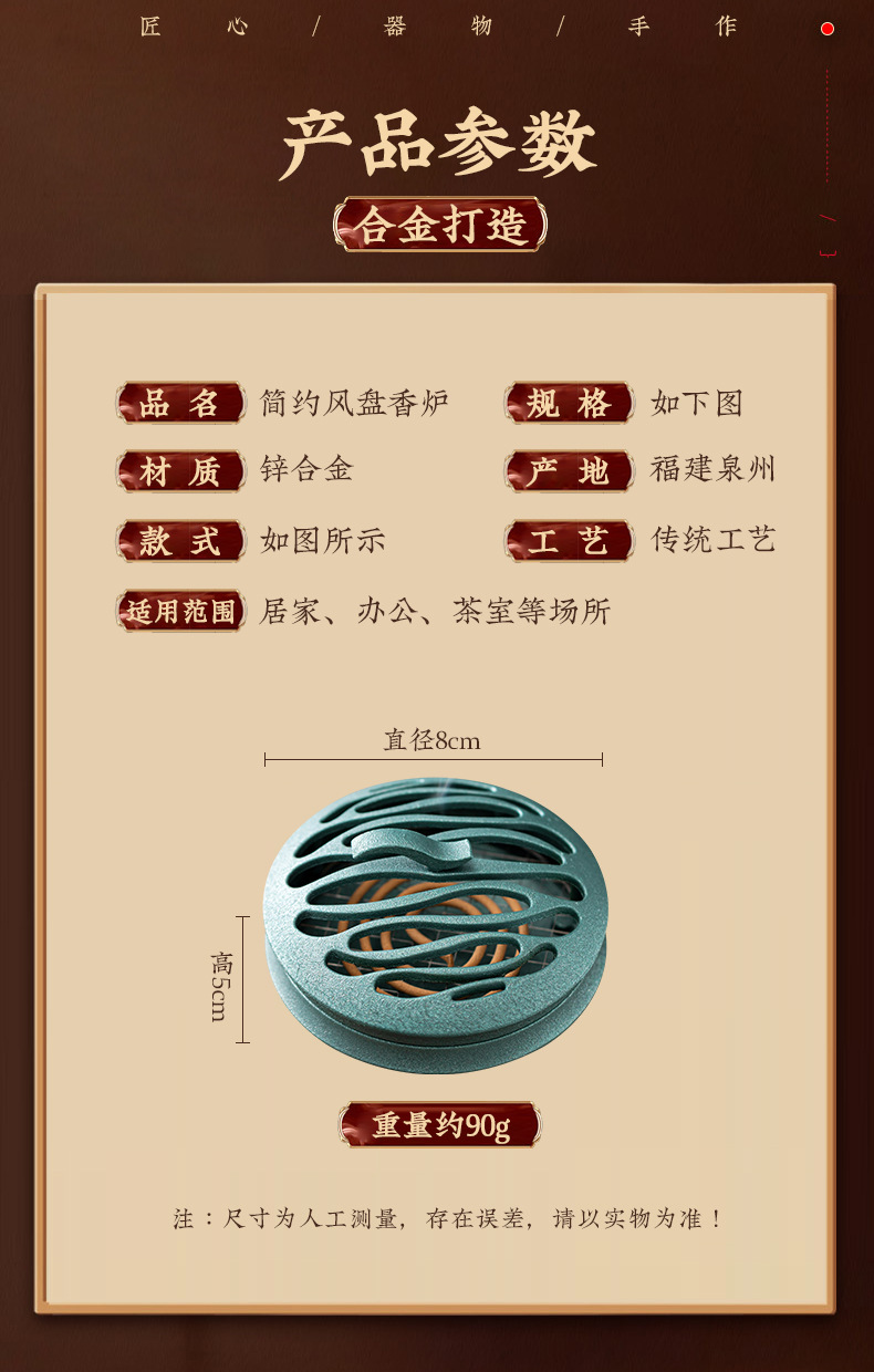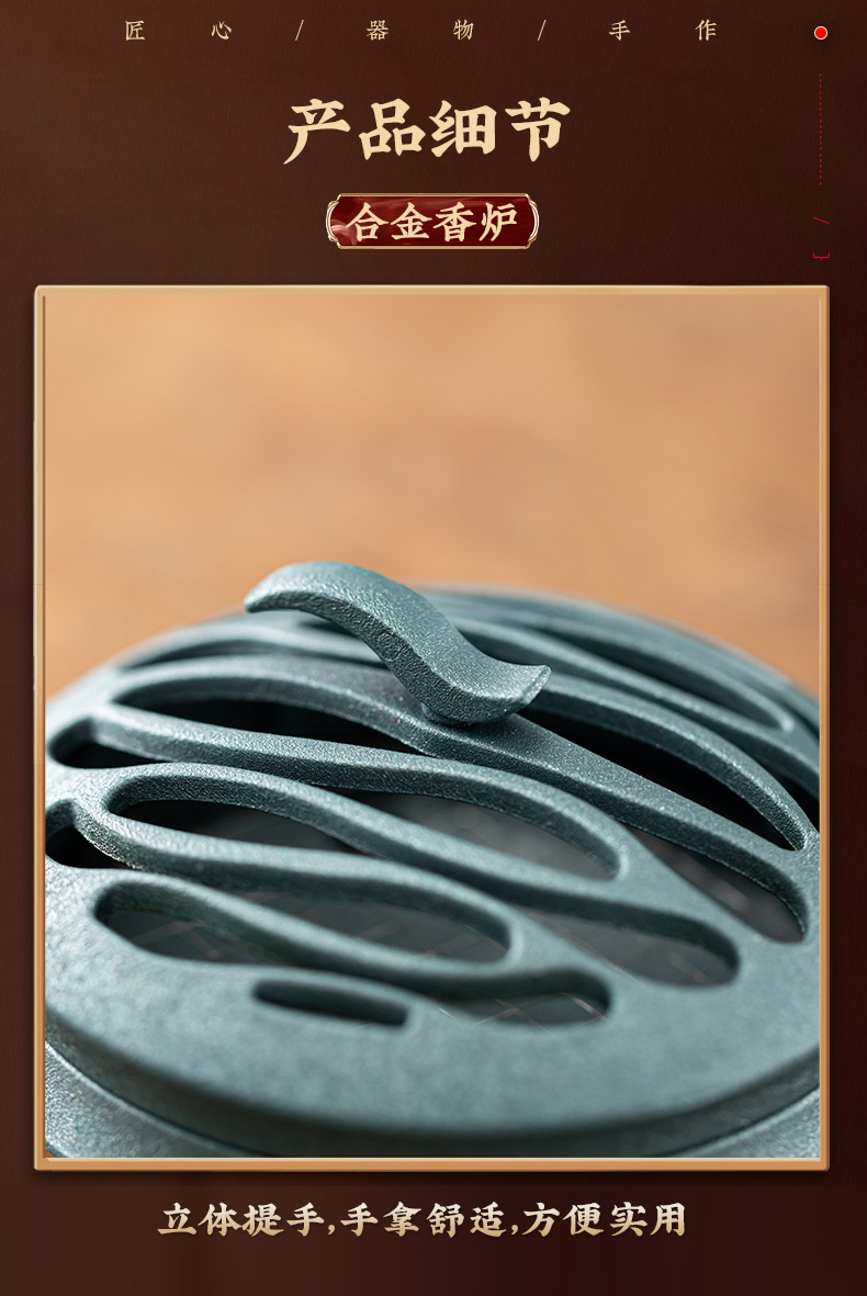 材质: 锌合金 工艺: 半手工半机械 品牌: 弘器五金 风格: 现代简约 包装: 纸盒包装 货号: F7687955SJJ8HJ 产地: 福建 是否进口: 否 产品编号: 云缕-盘香炉 专利类型: 外观设计专利 专利号: 咨询客服 是否专利货源: 是 主要销售地区: 欧洲,南美,东南亚,北美,其他 有可授权的自有品牌: 是 是否跨境出口专供货源: 是 重量: 0.001 kg/个